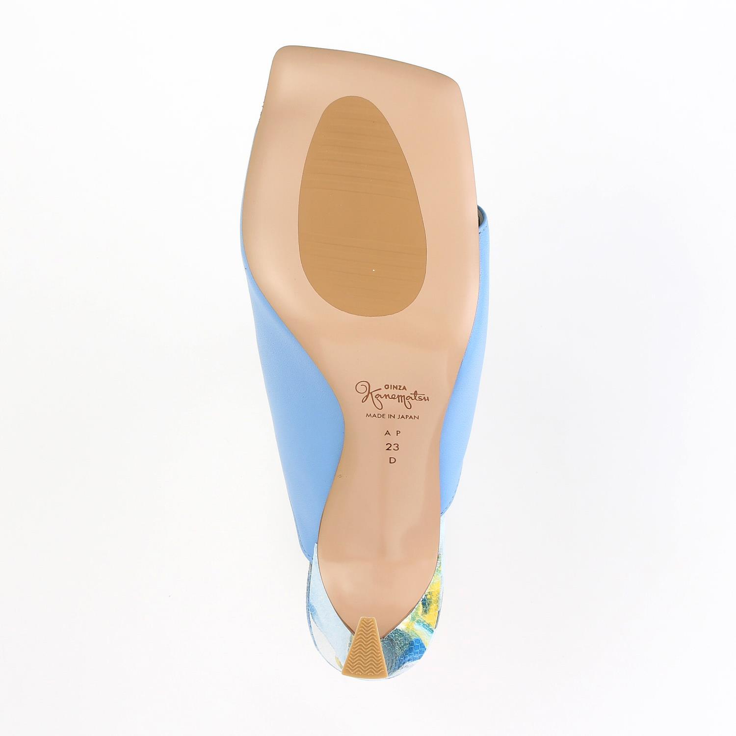 素材:シープ(羊革) プリント(本革) カラー展開:ブルー ヒール高さ:70㎜ ウィズ: D ヒール形状:スタンダード ヒール材質:革巻き サイズ展開:21.5cm~25.0cm 原産国:日本