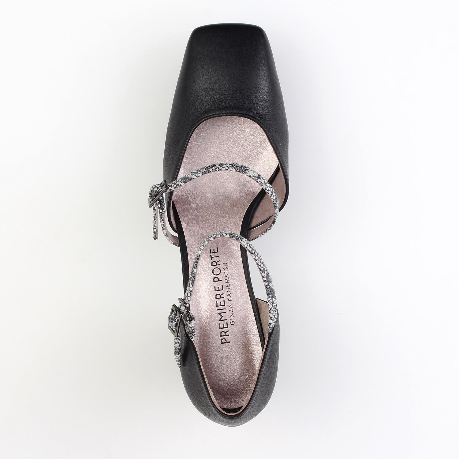 【PREMIERE PORTE】 ワイドスクエアの木型にブロックヒールを付けた、スタイリッシュなセパレートパンプス。 特徴的なシルエットとダブルストラップがトレンドのレトロムードも喚起するアイテムです。