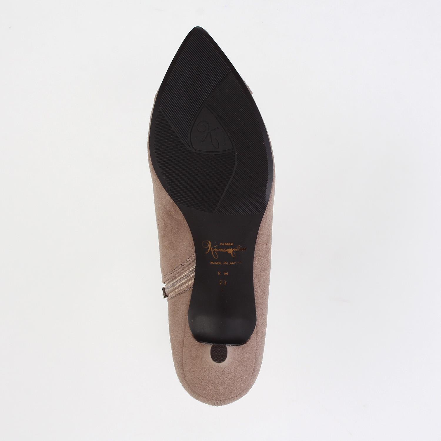 素材:スエード カラー展開:ダークベージュ ヒール高さ:65㎜ ウィズ: E ヒール形状:スタンダード ヒール材質:革巻き サイズ展開:21.5cm~25.5cm 原産国:日本