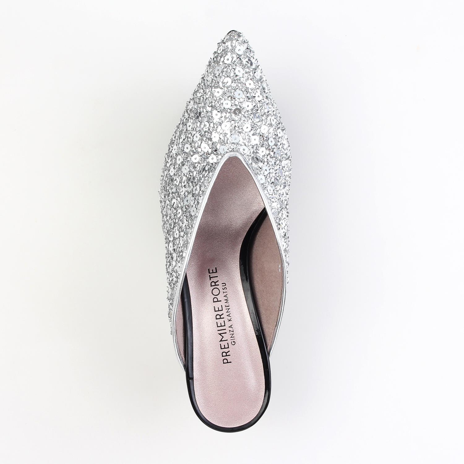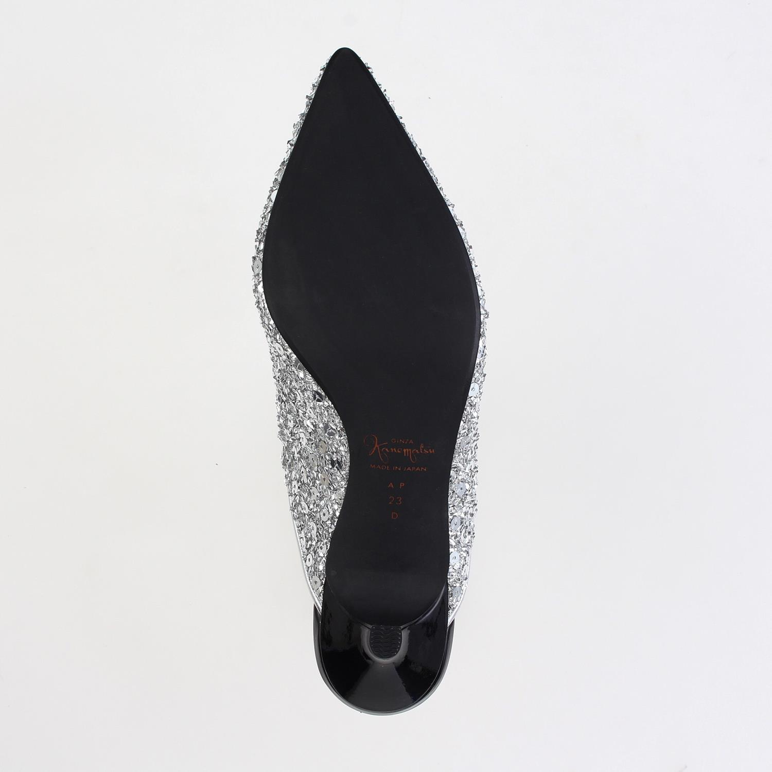 スパンコールなどのシャイニー感とクリスマスティンセルのような立体感あるメタリックテープを編み込んだ今季のトレンドを表現したキャッチ―なミュール。