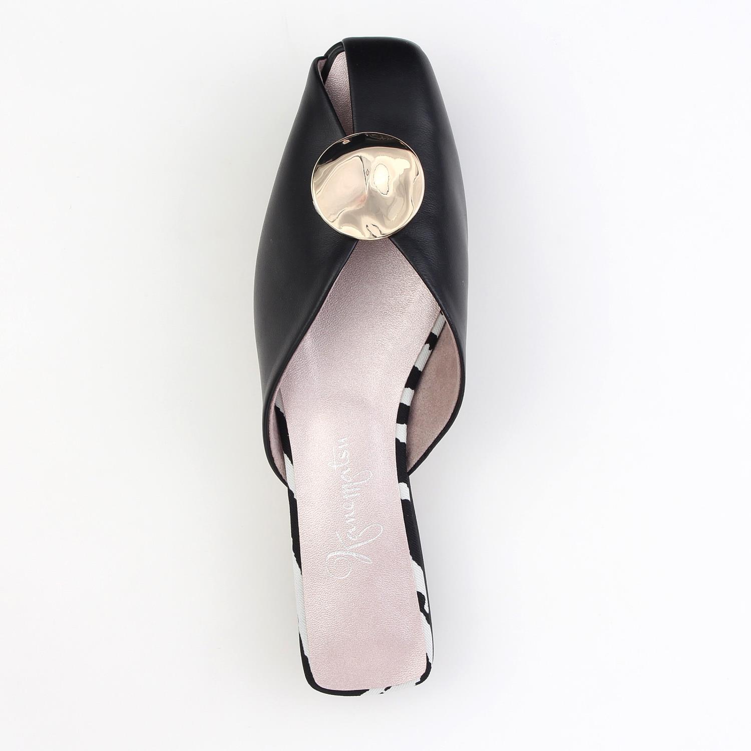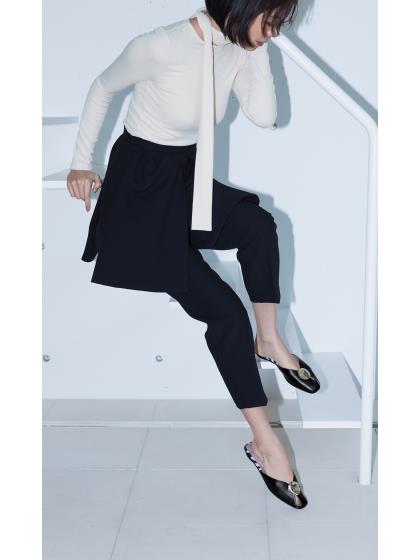 アシンメトリーに入ったスリットが今っぽい印象のフラットミュール。 つやっとしたメタルモチーフがアクセントで、キレイめな雰囲気とも好相性◎。 スリットの入ったロングスカートやワンピースに合わせれば、力の抜けたモードスタイルを作れます。