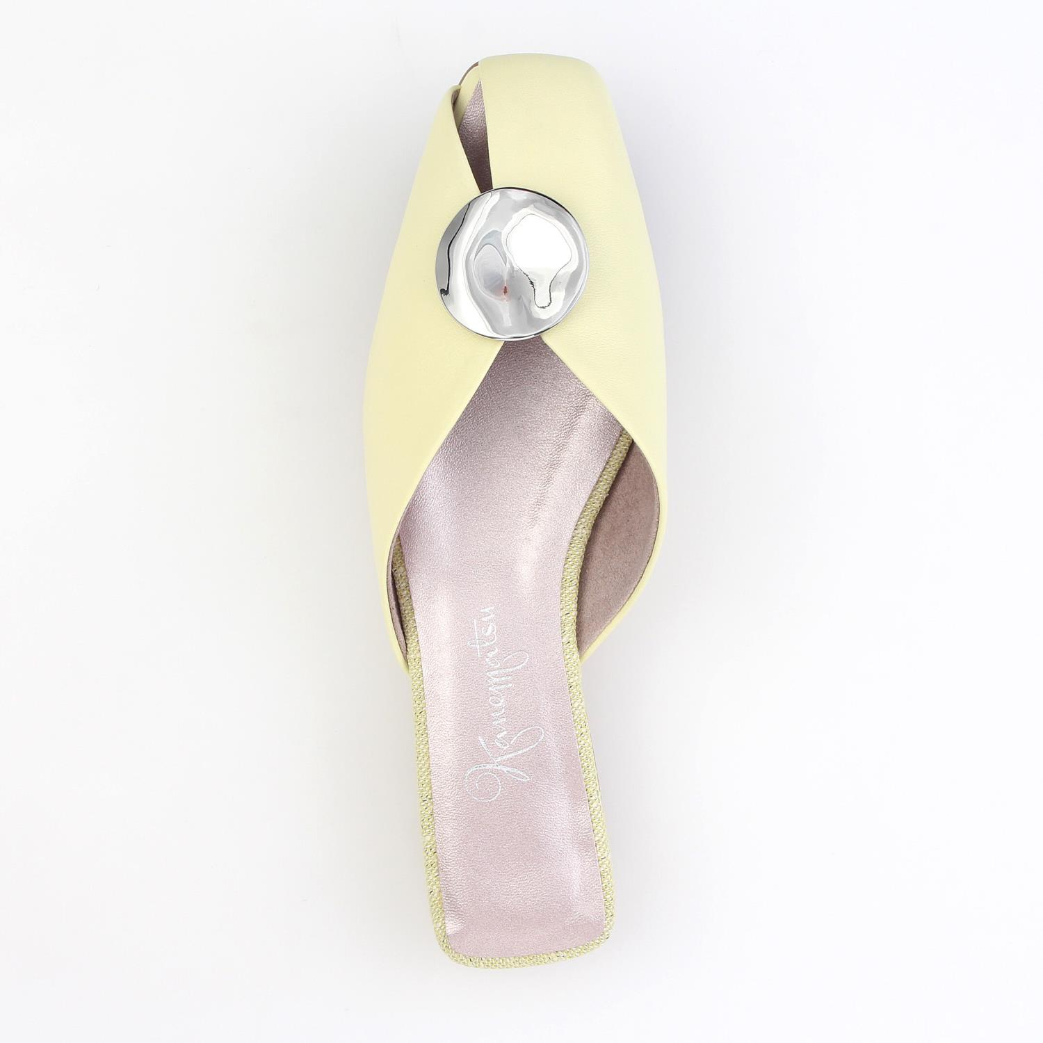 アシンメトリーに入ったスリットが今っぽい印象のフラットミュール。 つやっとしたメタルモチーフがアクセントで、キレイめな雰囲気とも好相性◎。 スリットの入ったロングスカートやワンピースに合わせれば、力の抜けたモードスタイルを作れます。