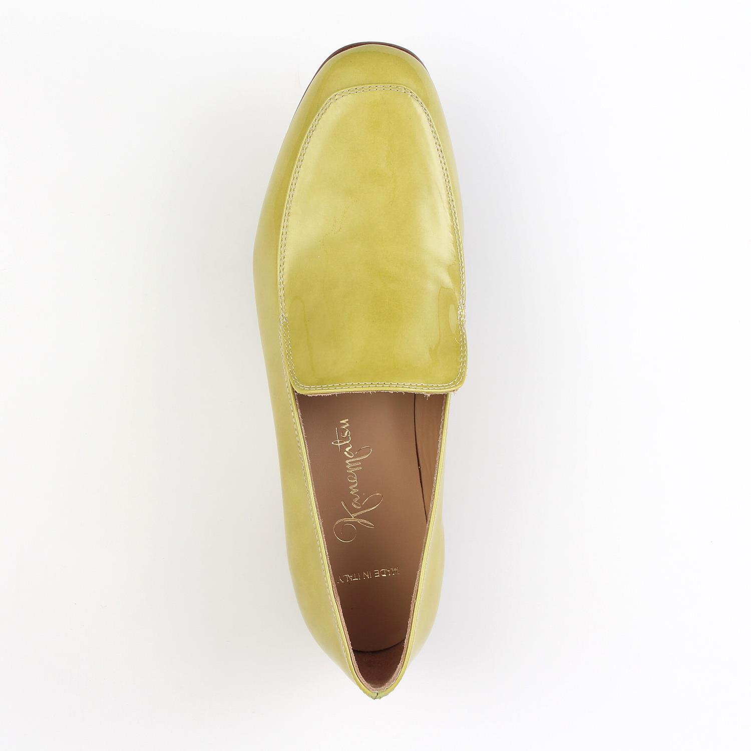 素材:エナメル カラー展開:ベージュ;イエローグリーン;ダークブルー ヒール高さ:25㎜ ウィズ: D ヒール形状:スタンダード ヒール材質:スタック サイズ展開:35.0~38.5 原産国:イタリア