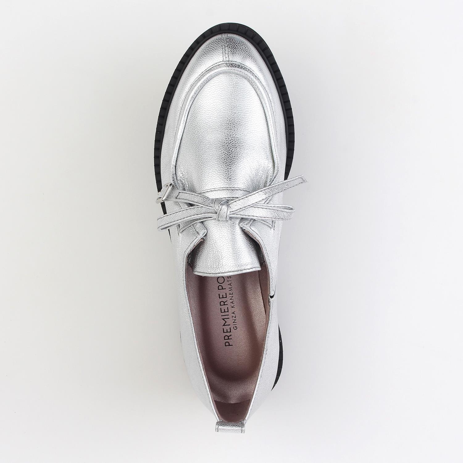 【PREMIERE PORTE】 トレンドのワラビーデザインをフェミニンに落とし込んだローファータイプ。 シューレースの部分をリボン風にアレンジし、剣先にはバックルをあしらってメタルのワンポイントを加えた一足です。