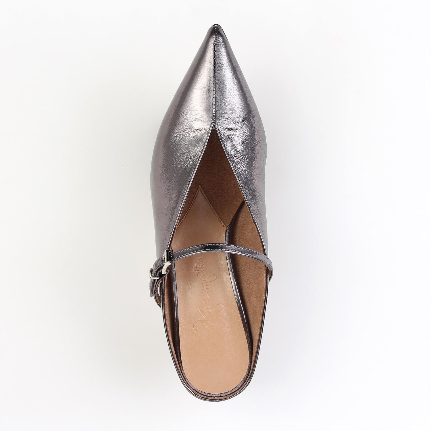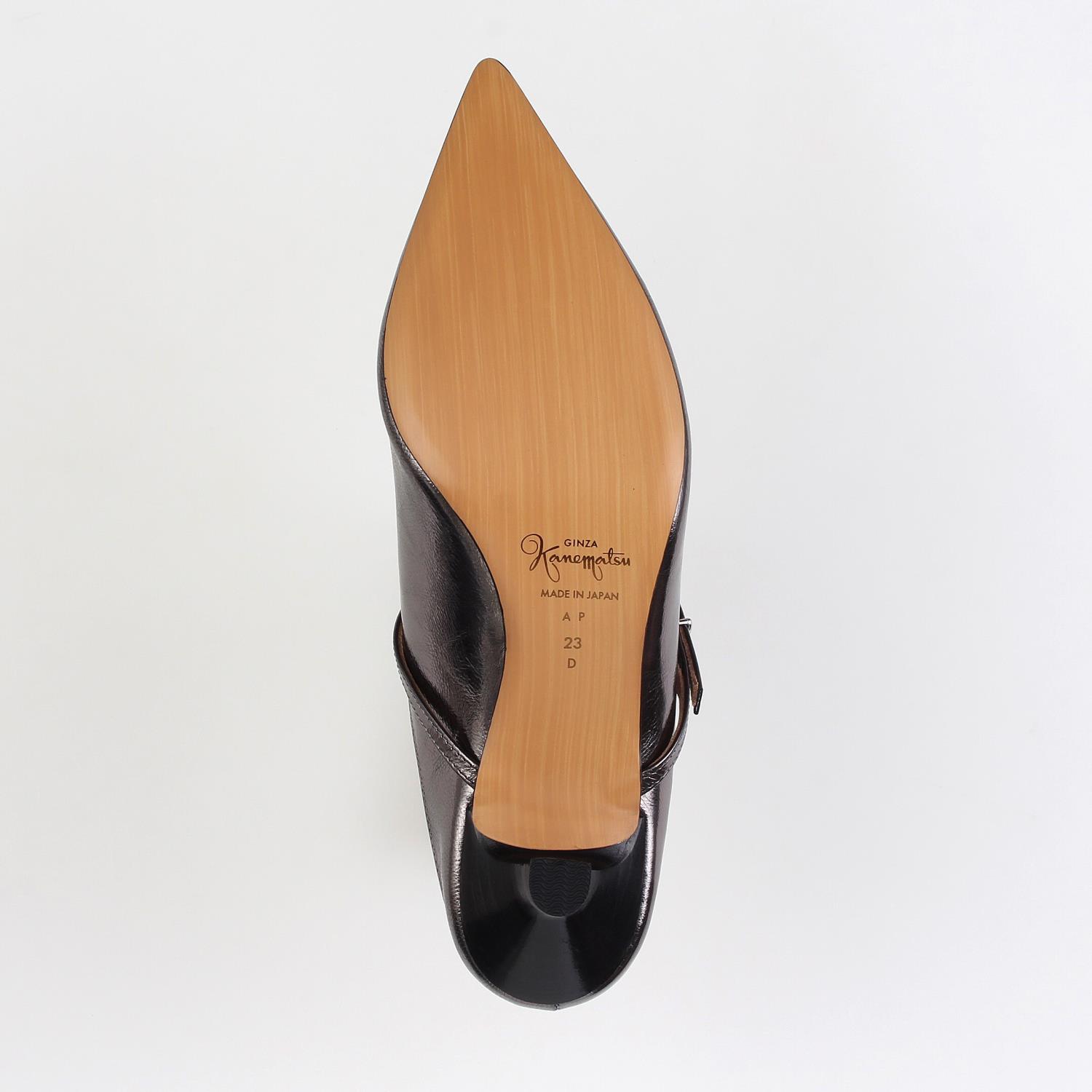 トップが浅めで鋭角なVカットと、メリージェーン風の甲ストラップがモードな印象をプラスする一足。