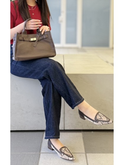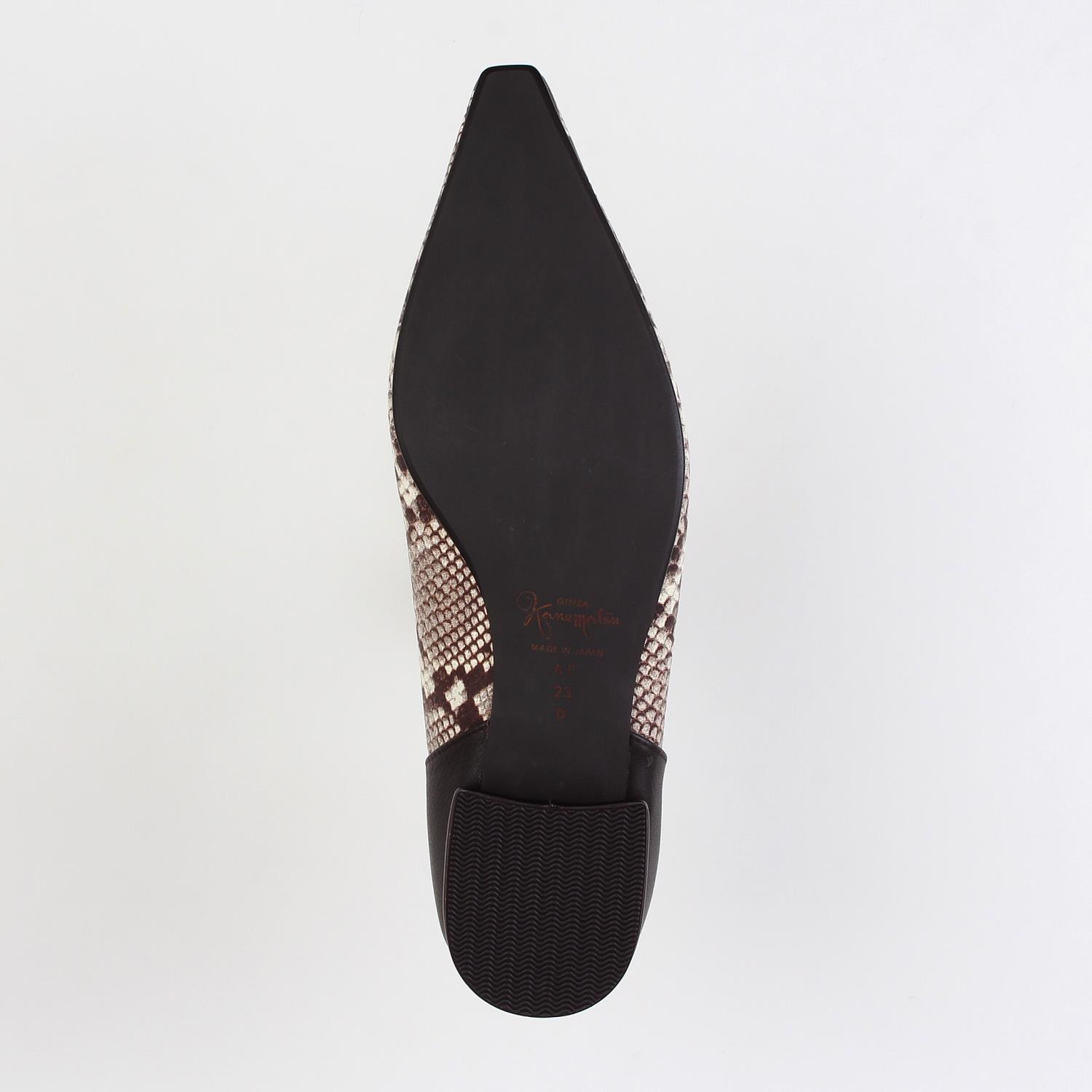 素材:プリント(本革) ステア(牛革) カラー展開:チョコ ヒール高さ:17㎜ ウィズ: D ヒール形状:ペタンコ・フラット ヒール材質:革巻き サイズ展開:21.5cm~25.0cm 原産国:日本