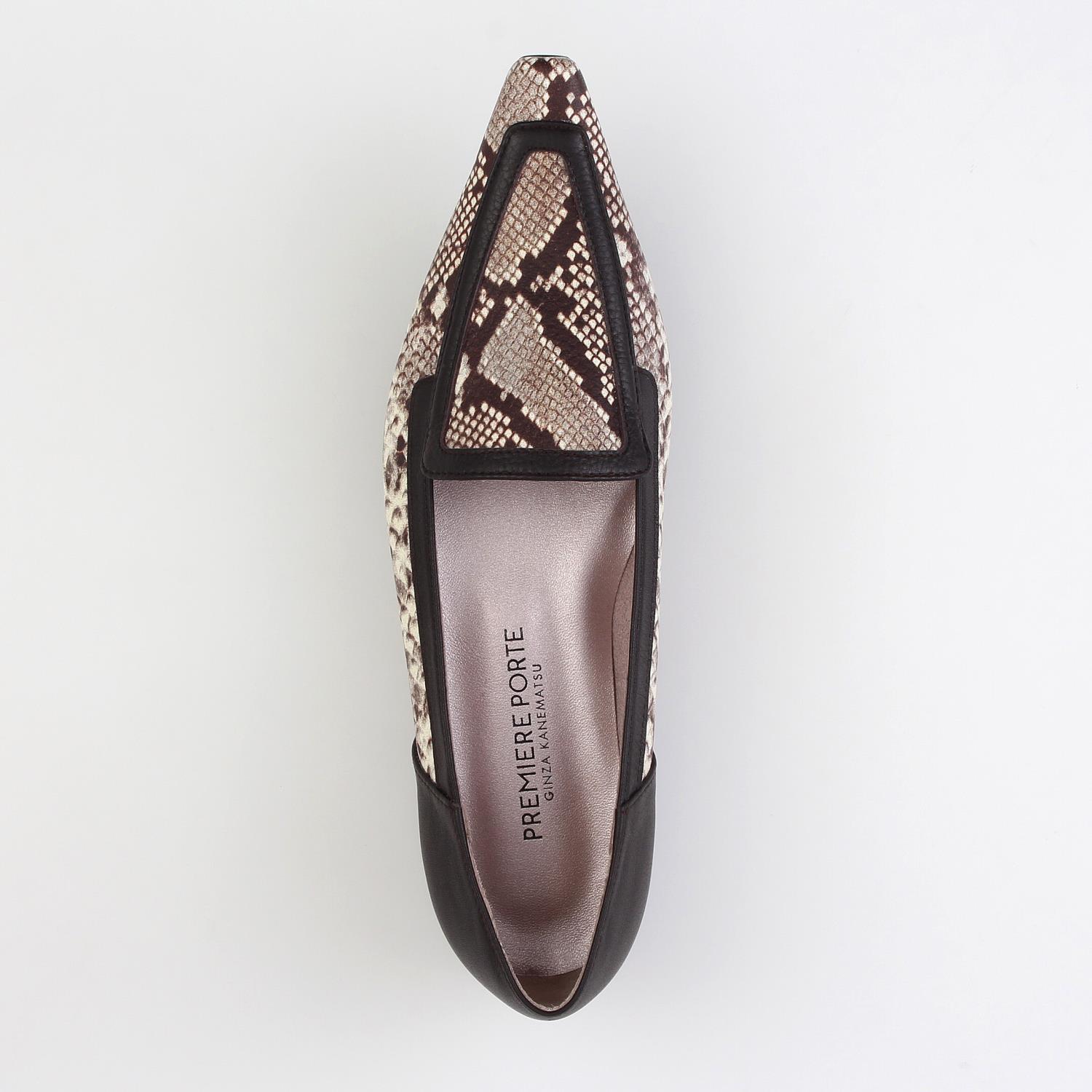 【PREMIERE PORTE】 シャープなシルエットとモカ風デザインがポイントのローファーパンプス。 ロングノウズ&プチスクエアのシルエットが全体をモードに引き締め、大人っぽくモダンな雰囲気を漂わせます。