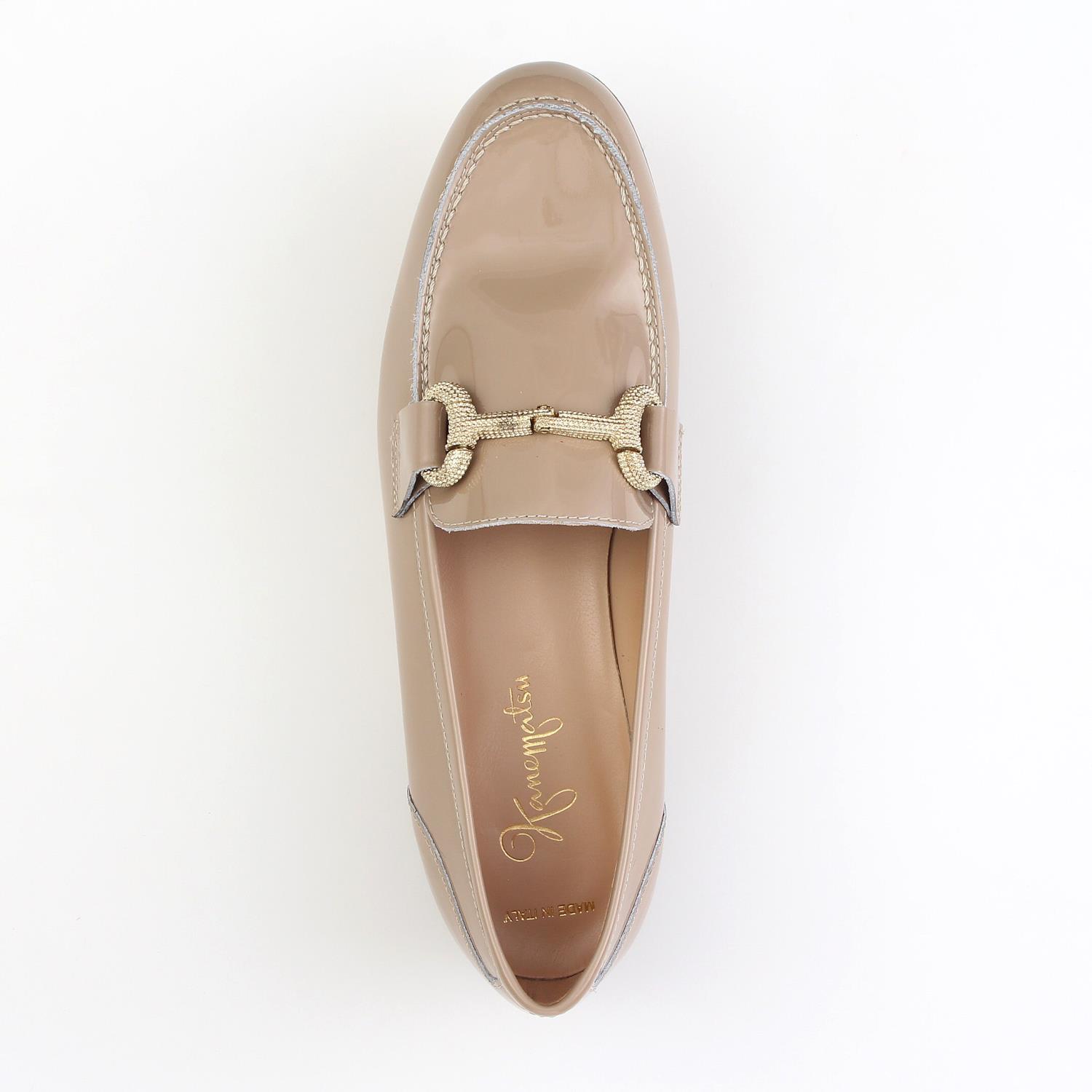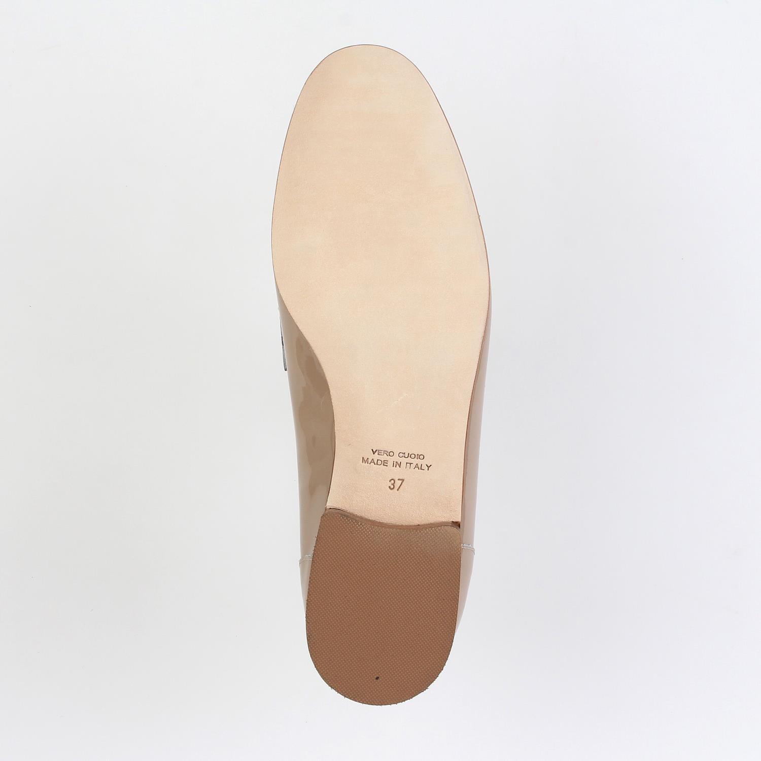 素材:エナメル カラー展開:ベージュ;ダークブルー ヒール高さ:24㎜ ウィズ: D ヒール形状:ペタンコ・フラット ヒール材質:スタック サイズ展開:34.5~39.0 原産国:イタリア
