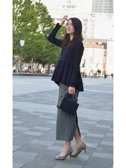 細身の木型を使用したコンビネーションパンプス。 質感の異なる3種類の素材をトーンオントーンで組み合わせたさり気ないミックス感を楽しめます。<SLENDER/AQUA BELL>