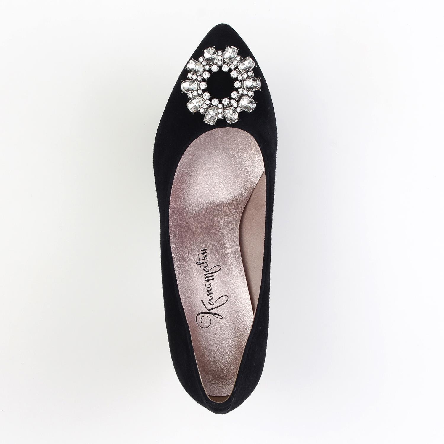 アーモンドトゥが優し気な印象のヒールパンプス。 華やかなサークル状のビジューバックルが足元を明るく演出します。 普段使いはもちろんオケージョンシーンでも活躍しそうな一足です。