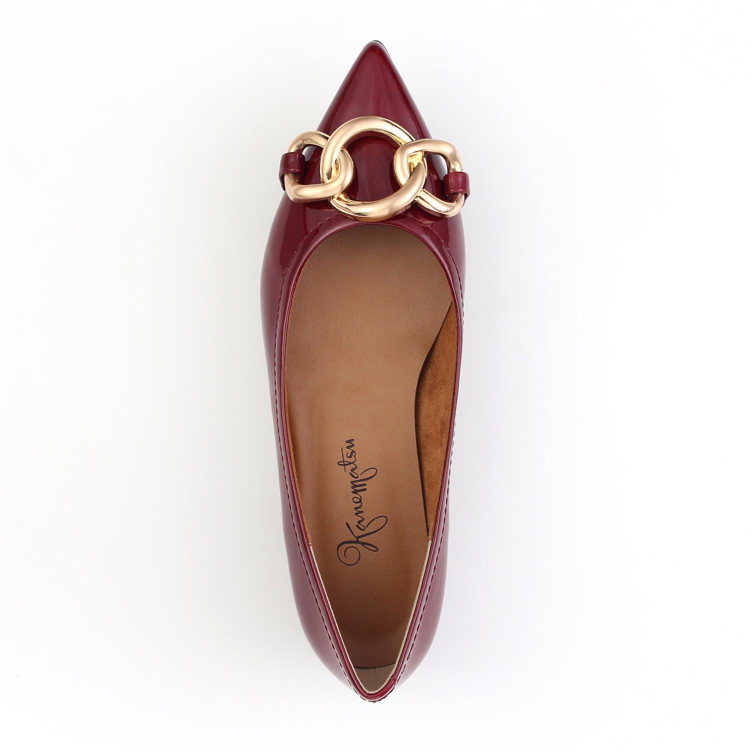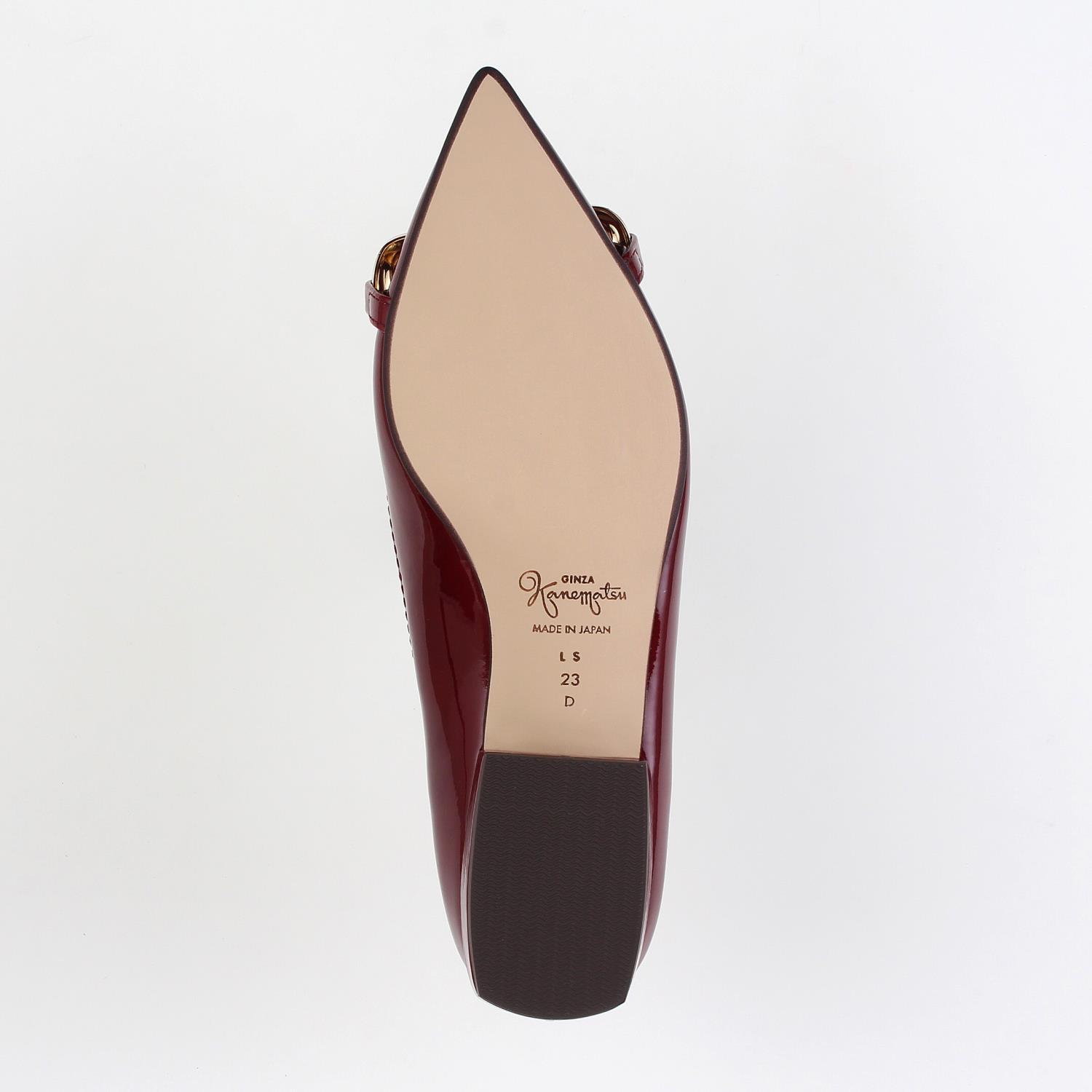 素材:エナメル カラー展開:ワイン ヒール高さ:21㎜ ウィズ: D ヒール形状:ペタンコ・フラット ヒール材質:革巻き サイズ展開:21.0cm~26.0cm 原産国:日本