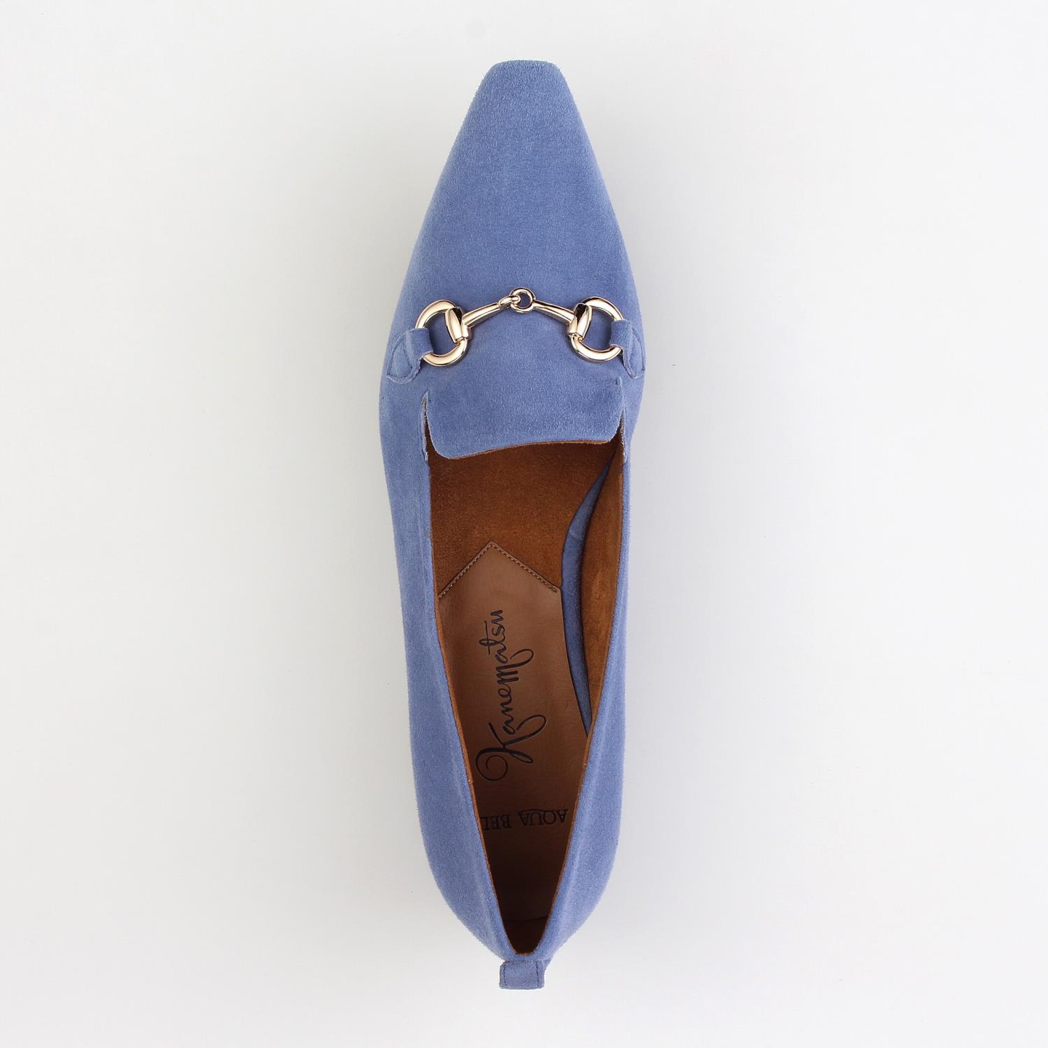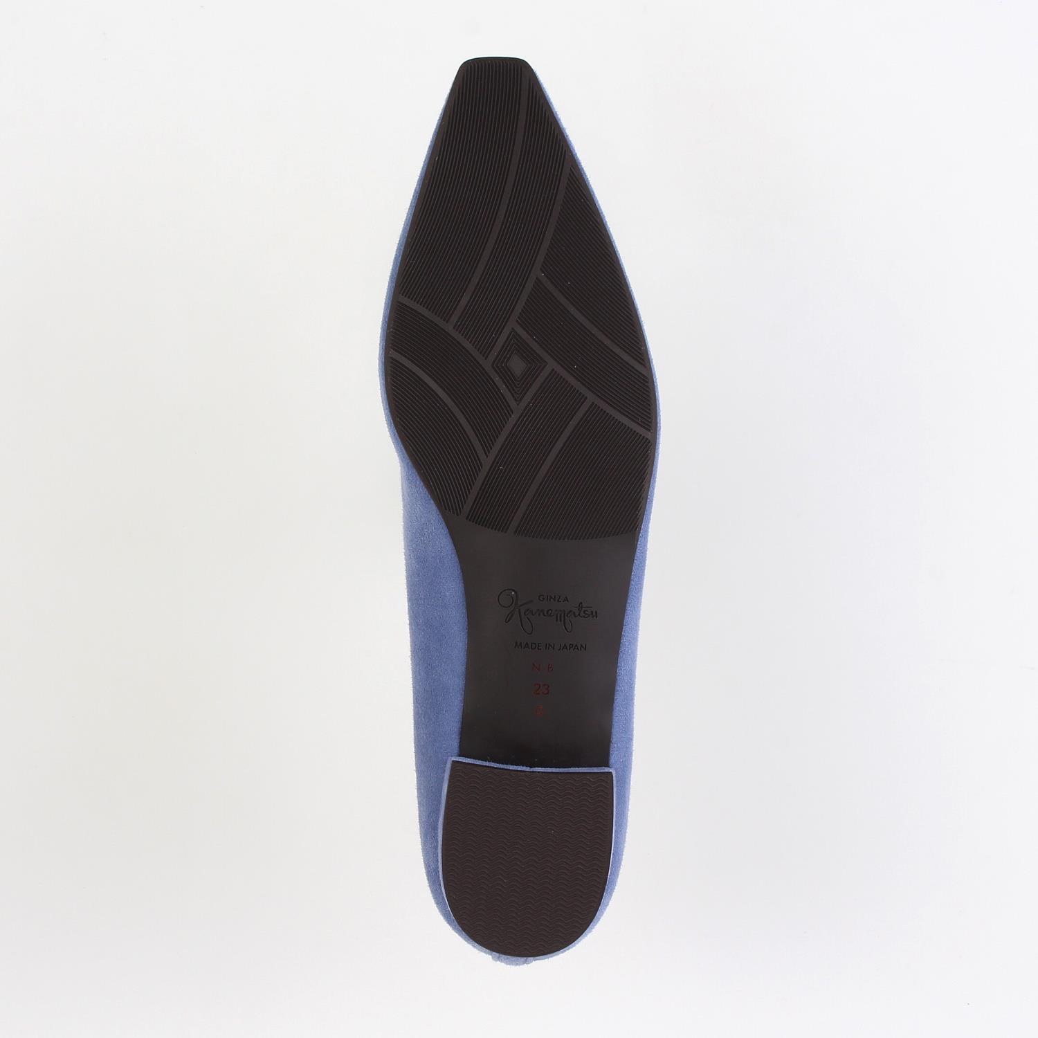 素材:スエード カラー展開:ブルー ヒール高さ:17㎜ ウィズ: D ヒール形状:ペタンコ・フラット ヒール材質:革巻き サイズ展開:21.5cm~25.5cm 原産国:日本