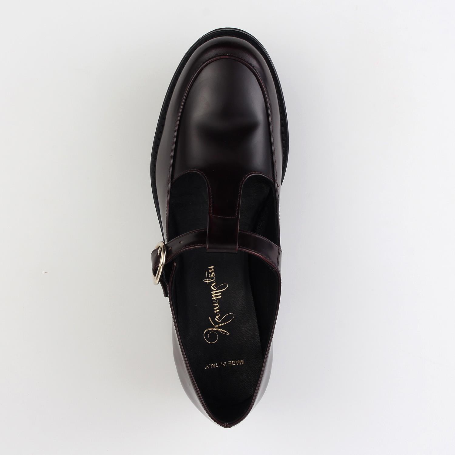 Tストラップデザインのヒールアップローファー。 丸型のバックルが程よいアクセントをプラス。 シンプルでも洗練されたシルエットでデイリーに履きやすい一足です。