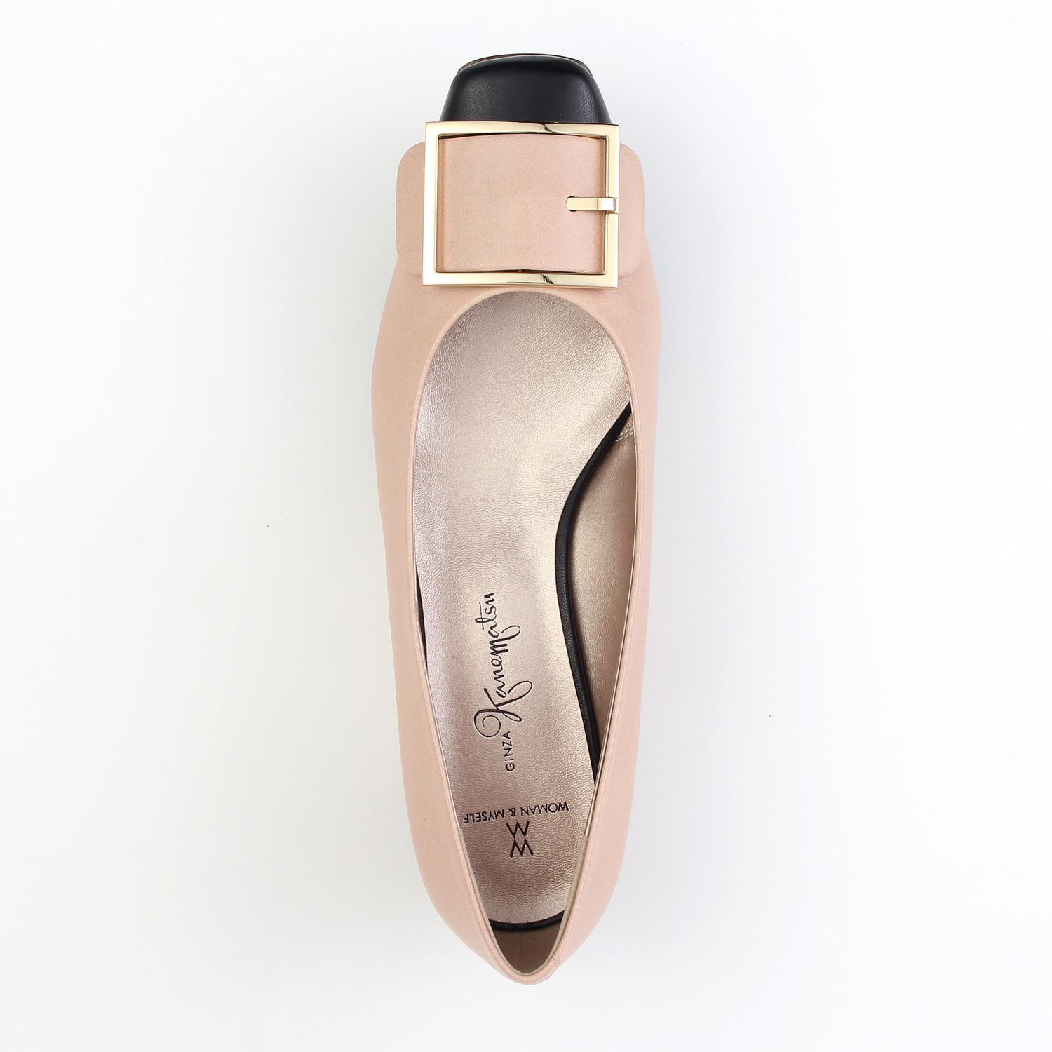 ゆったりめの木型を使用したローヒールパンプス。 きちんと感のあるバックルとオシャレ心をくすぐるつま先の切り替えがポイント。 程よいデザイン性があって履き心地も良いので、お仕事用としてお勧めの一足です。<WOMAN&MYSELF>