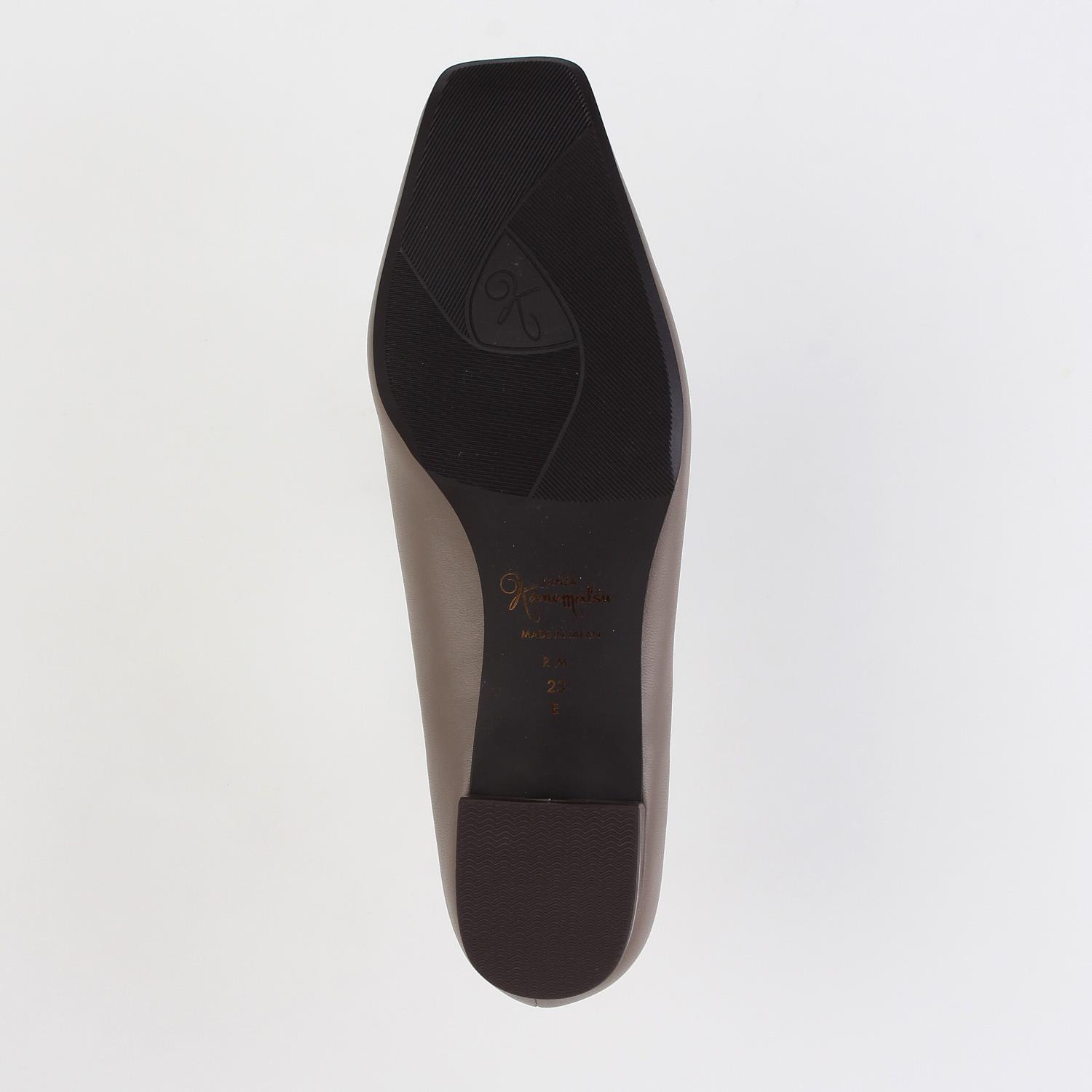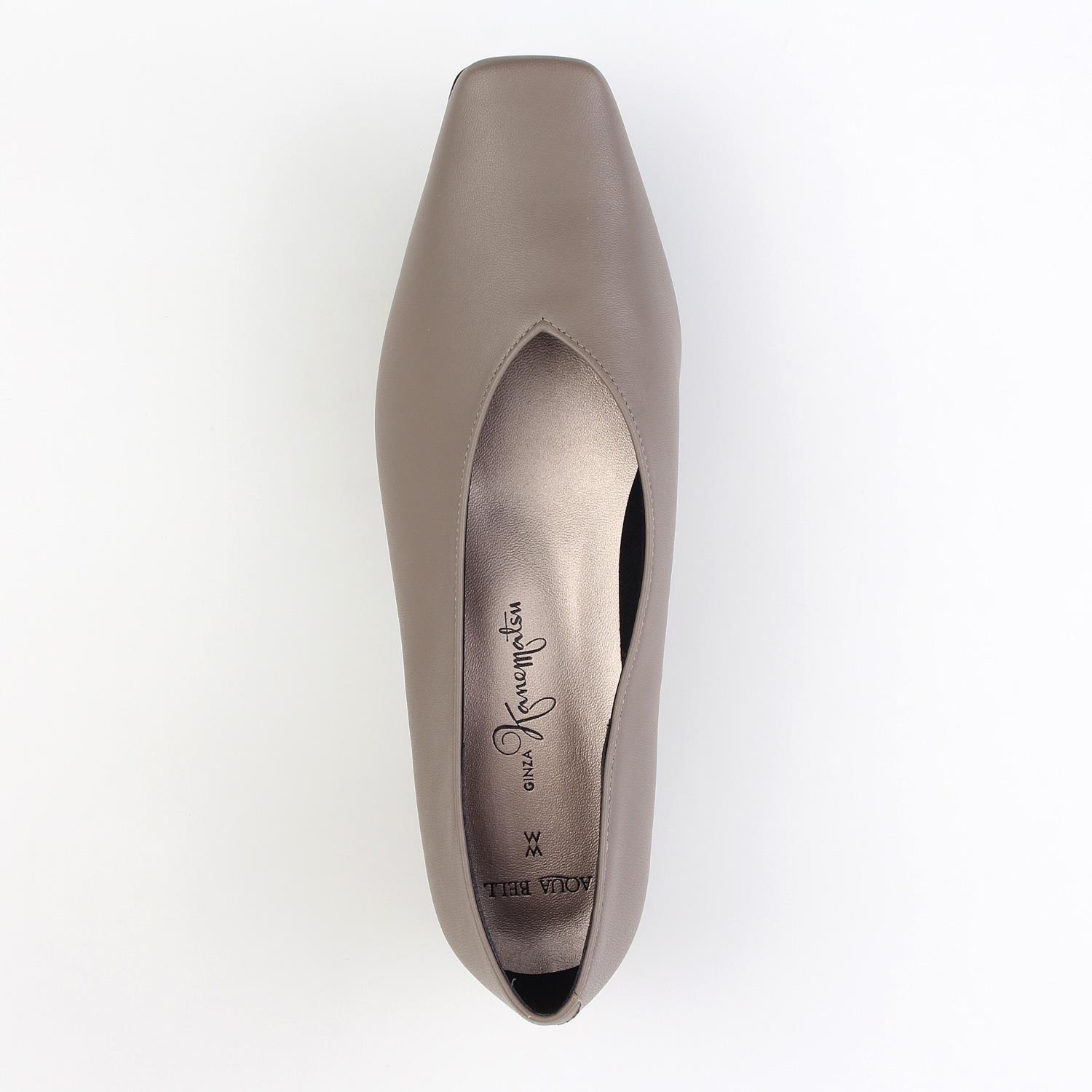 ローヒールでもすっきりとした足元を演出できる深めのVカットがポイント。