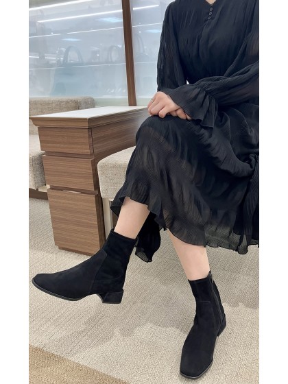 素材:スエード カラー展開:ブラック ヒール高さ:32㎜ ウィズ: E ヒール形状:スタンダード ヒール材質:革巻き ブーツ筒丈:16cm ブーツ筒周り:20cm サイズ展開:21.5cm~25.5cm 原産国:日本