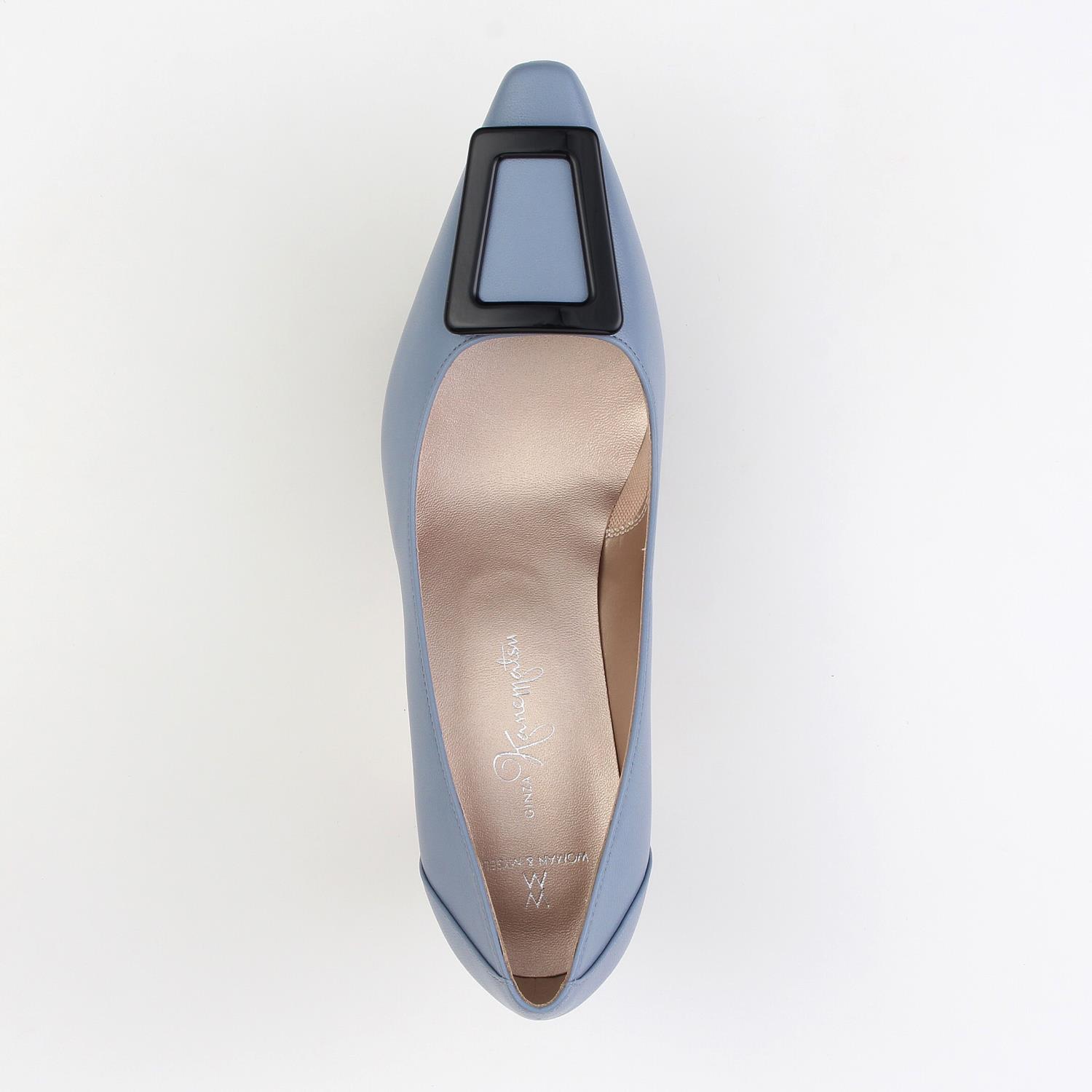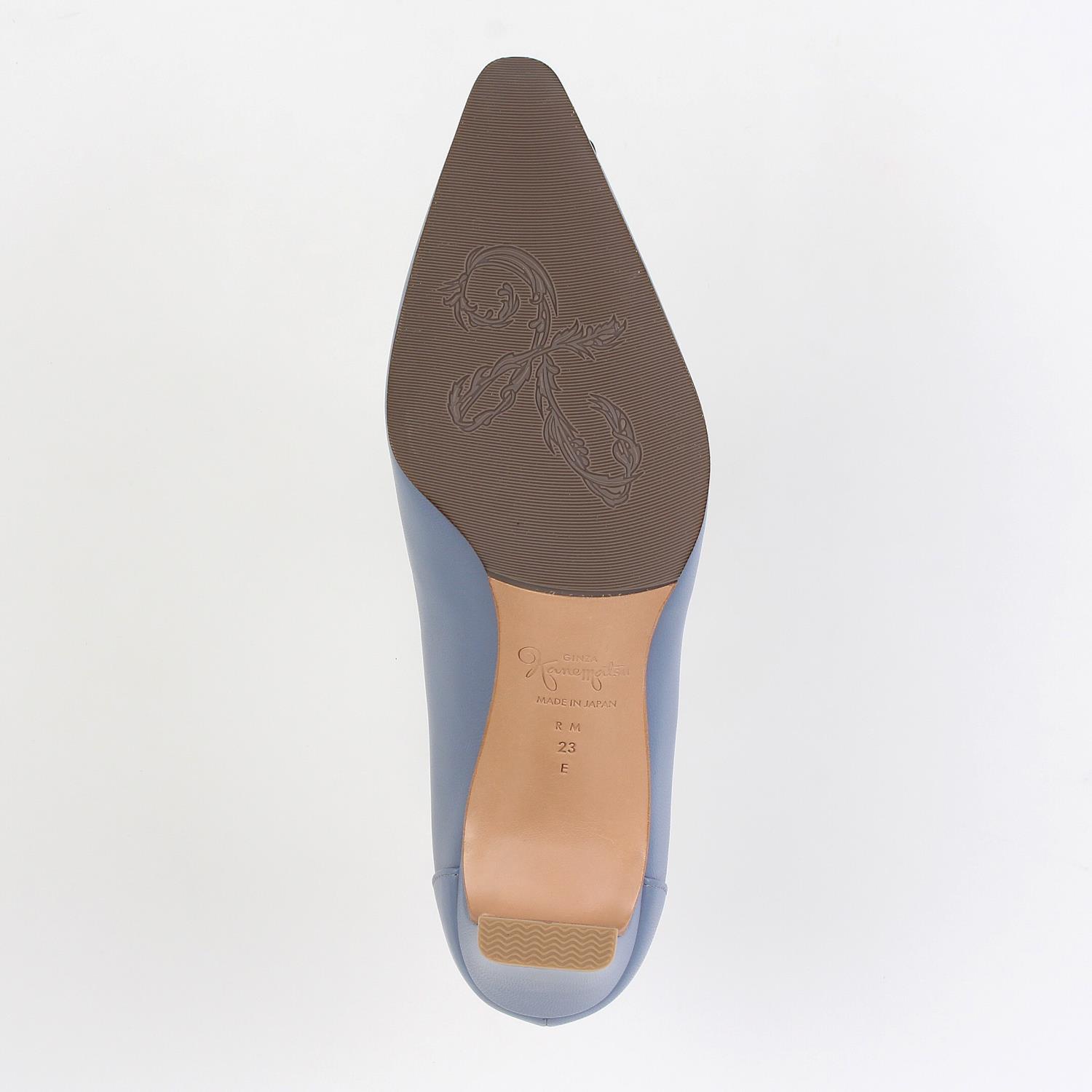 セットバック気味のプレートヒールでスマートなシルエットに仕上げ、オリジナルで作ったアクリル素材のバックルでシャープさとモダンさを表現しました。