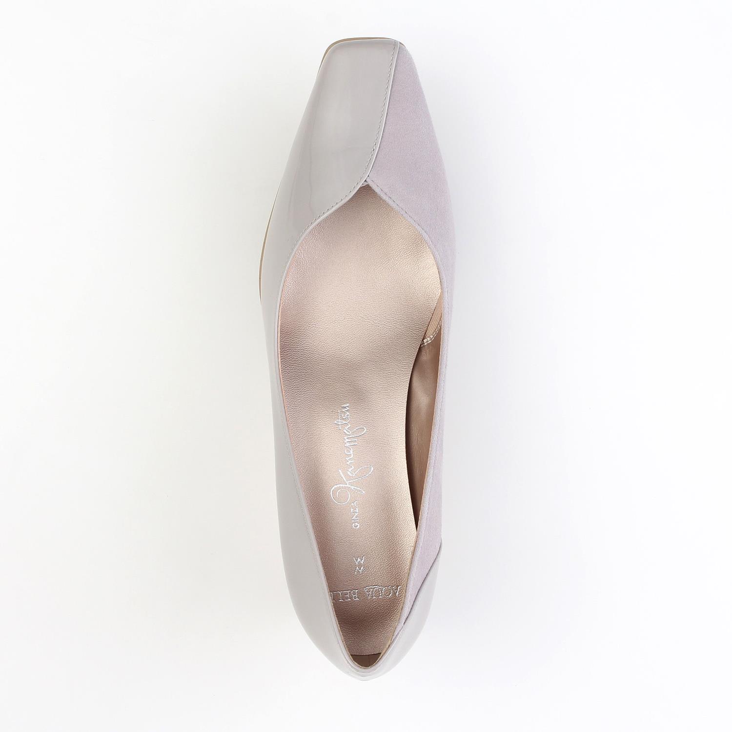 素材:エナメル スエード カラー展開:ライトグレー;ブラック ヒール高さ:50㎜ ウィズ: E ヒール形状:スタンダード ヒール材質:革巻き サイズ展開:21.0cm~25.5cm 原産国:日本