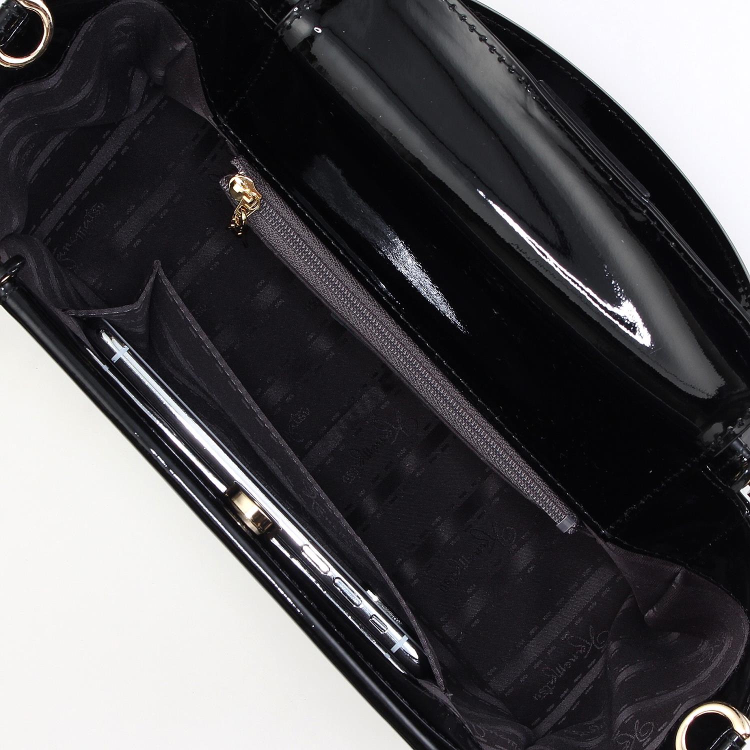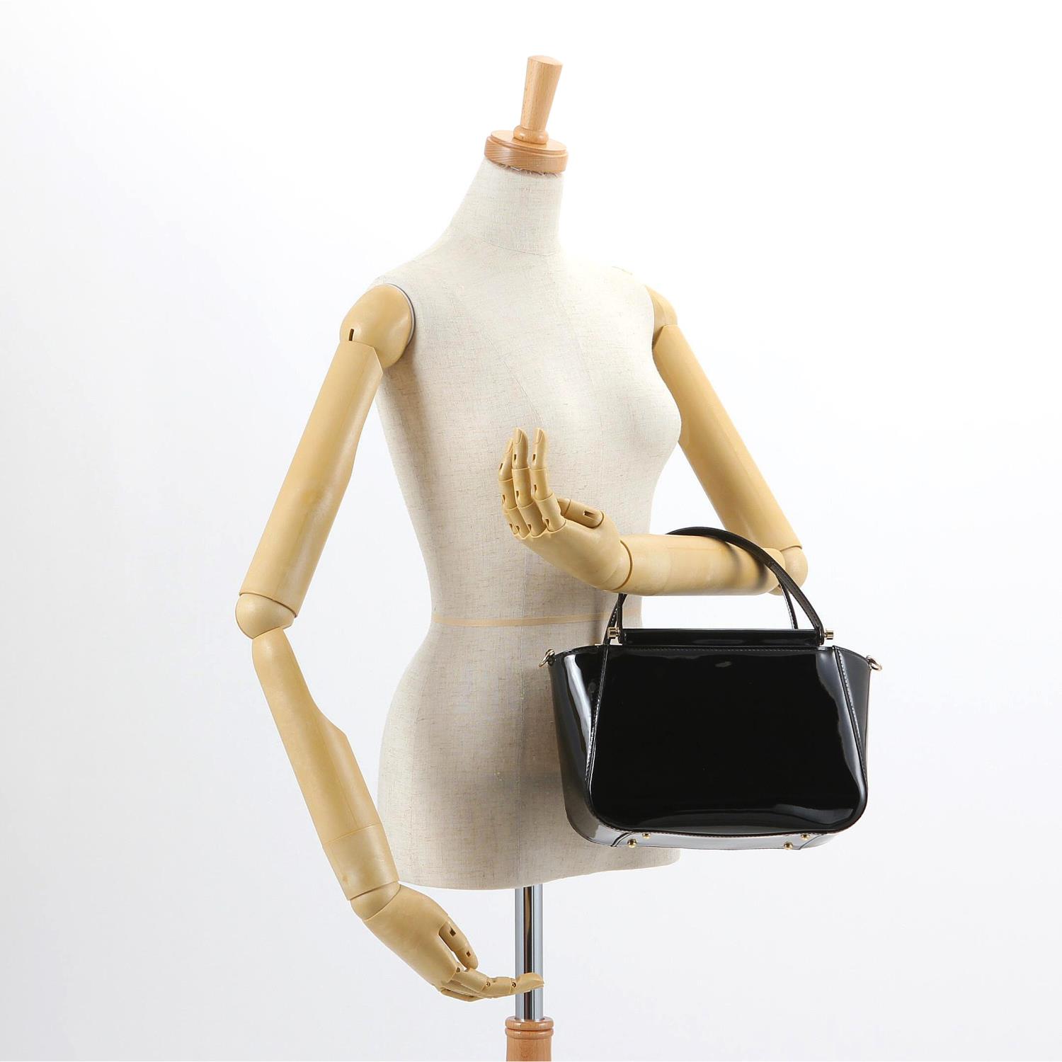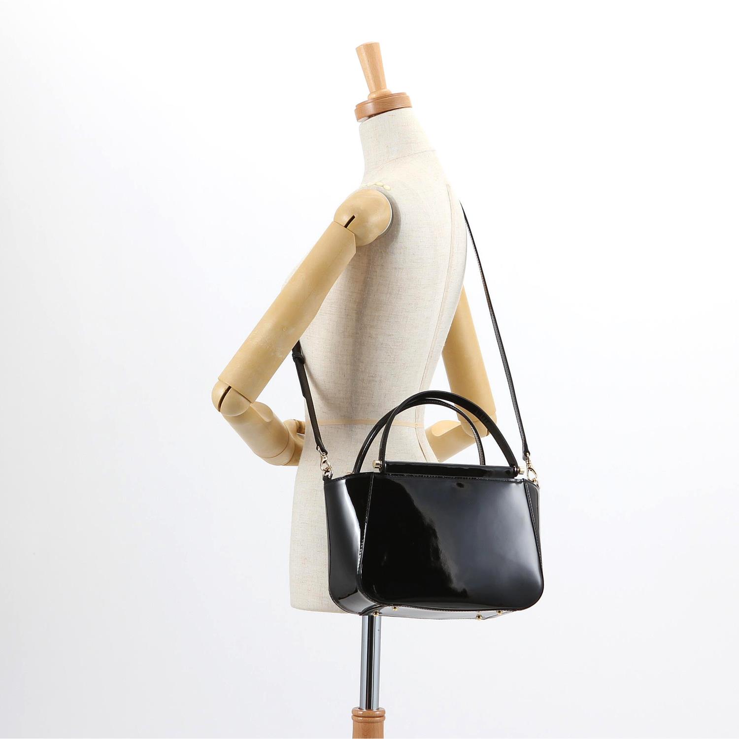 トレンドのエナメル素材で華やかに仕上げたハンドバッグ。