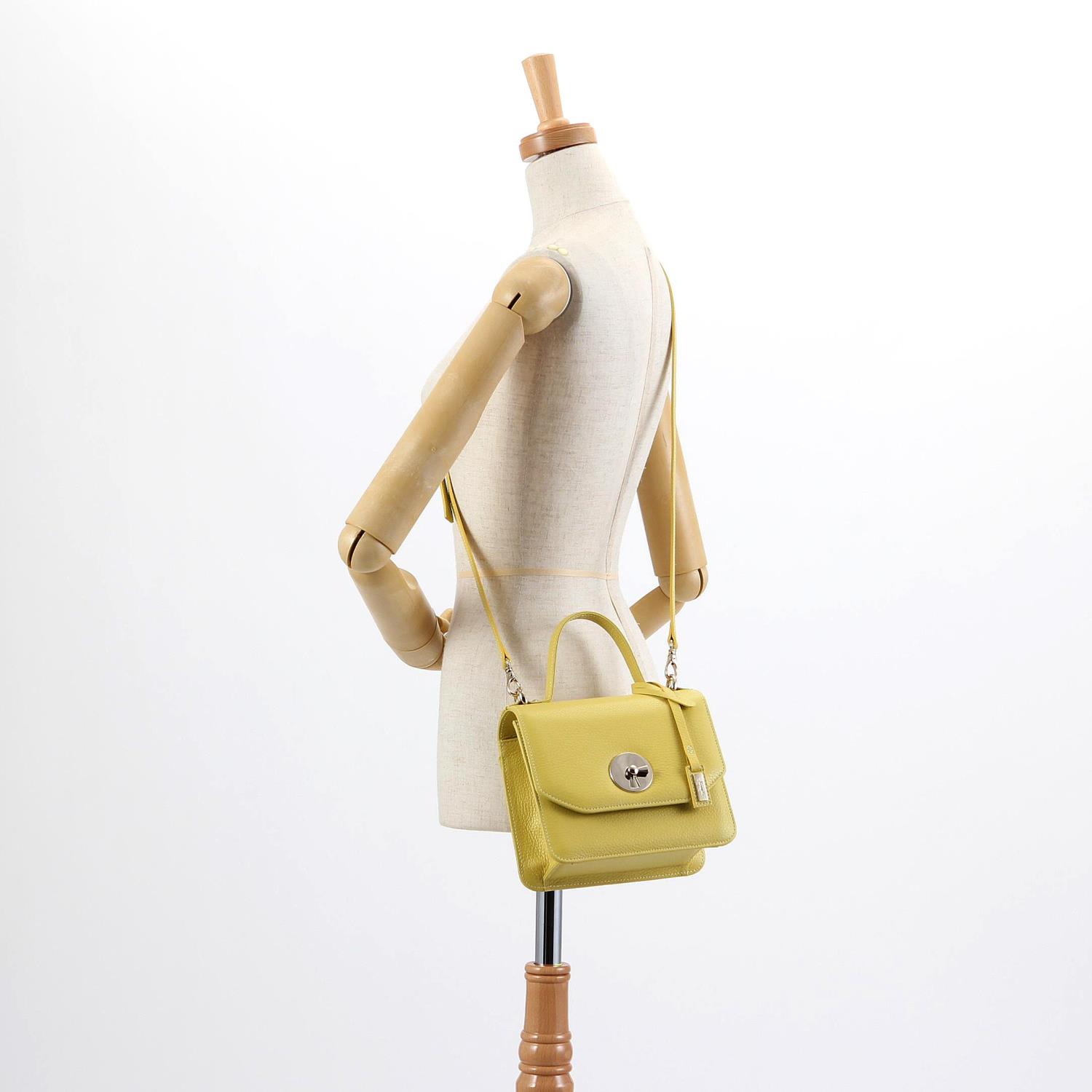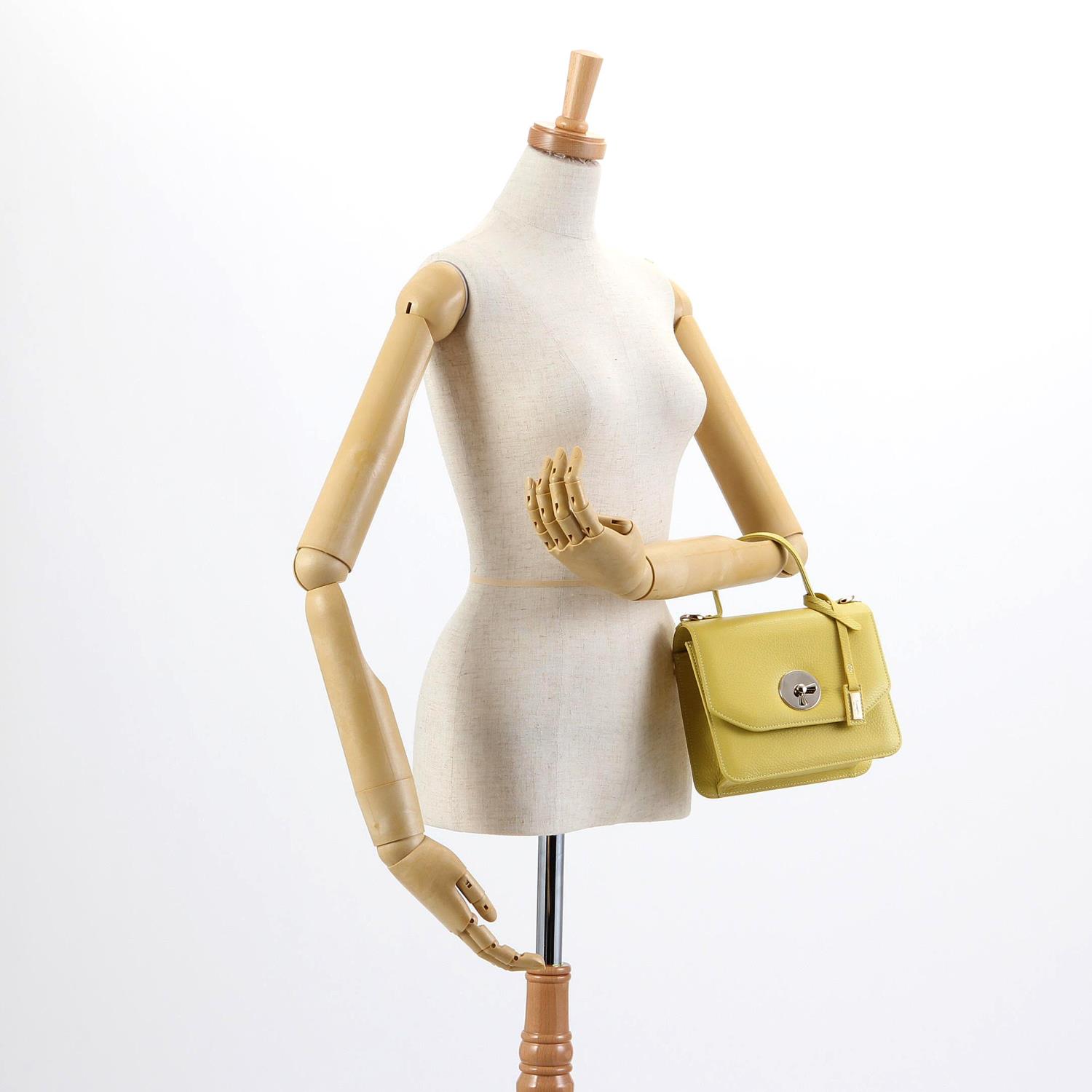 時計のような大きなひねりがレトロな雰囲気のショルダーバッグ。 コーディネートのポイントに使いやすい小さめバランスに仕上げました。 取り外しのできるショルダー紐が付属した2Way仕様です。