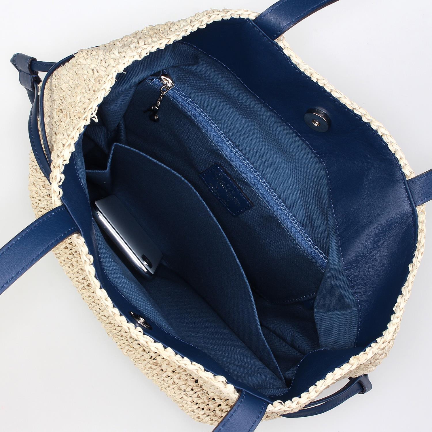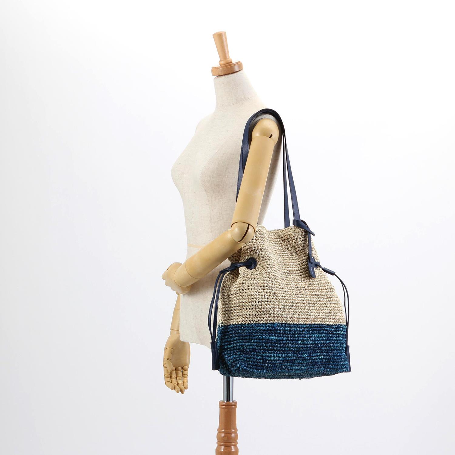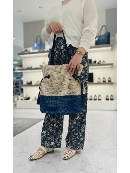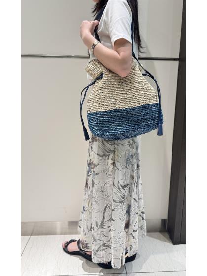 ラフィア素材をバイカラーに編んだA4対応の巾着型カゴバッグ。 大きめのサイズ感でも軽いのが嬉しいポイント。ラフな雰囲気でこなれ感を演出してくれるアイテムです。 ※天然素材の染色部分は素材の特性上多少の色落ちが生じる場合があります。