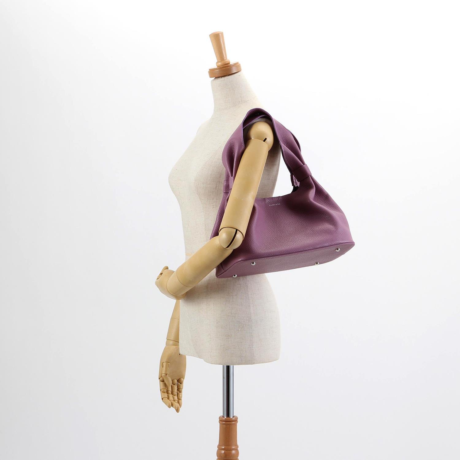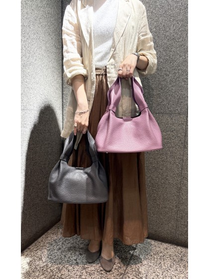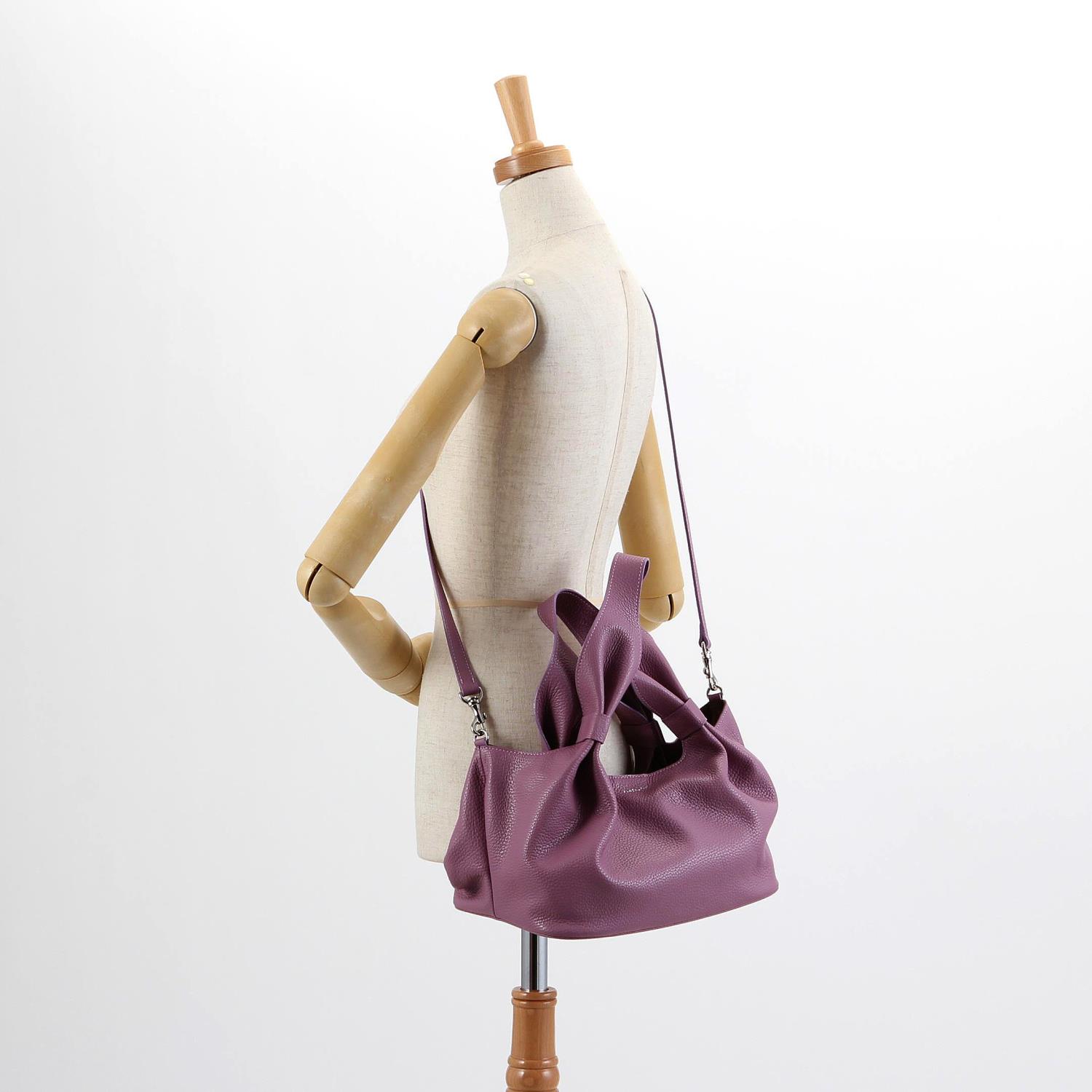 丸みのあるシルエットが女性らしい印象のショルダーバッグ。 ハンドルから本体にかけてできる曲線を描くドレープが柔らかさと華やかさを演出します。 取り外しのできるショルダー紐が付属した2Way仕様です。