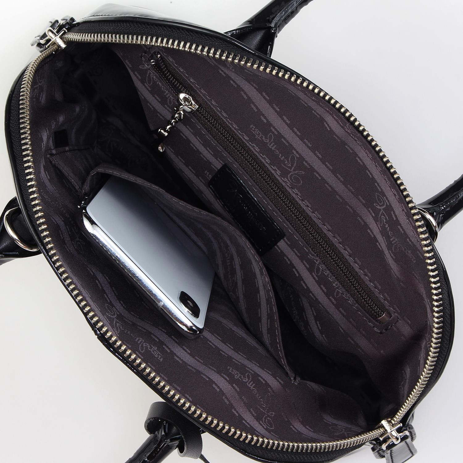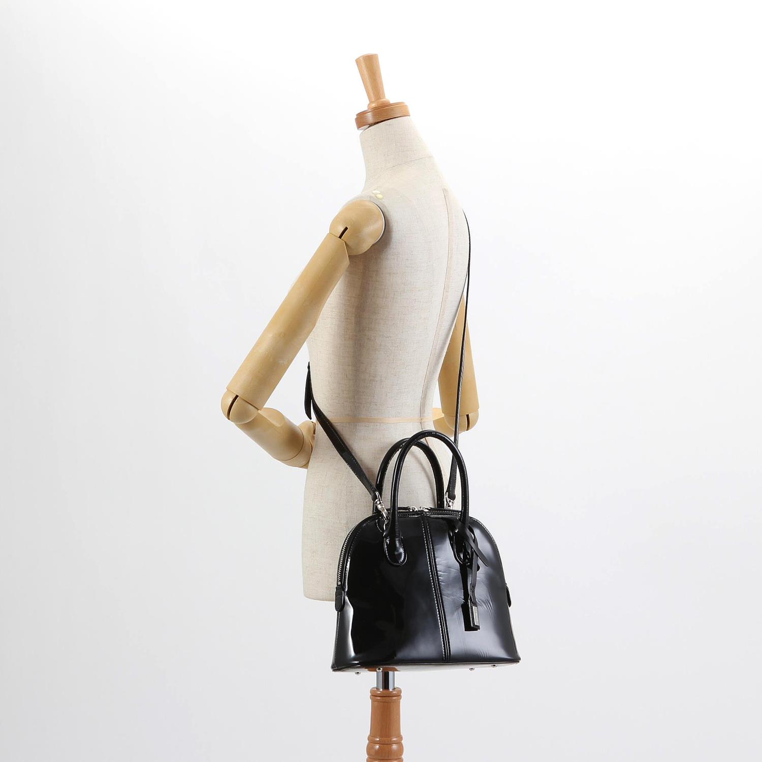 エナメルレザーを使用したショルダーバッグ。 小さめのブガッティ型は、キレイめにもカジュアルにも合わせやすいのが◎。 取り外しのできるショルダー紐が付属した2Way仕様です。