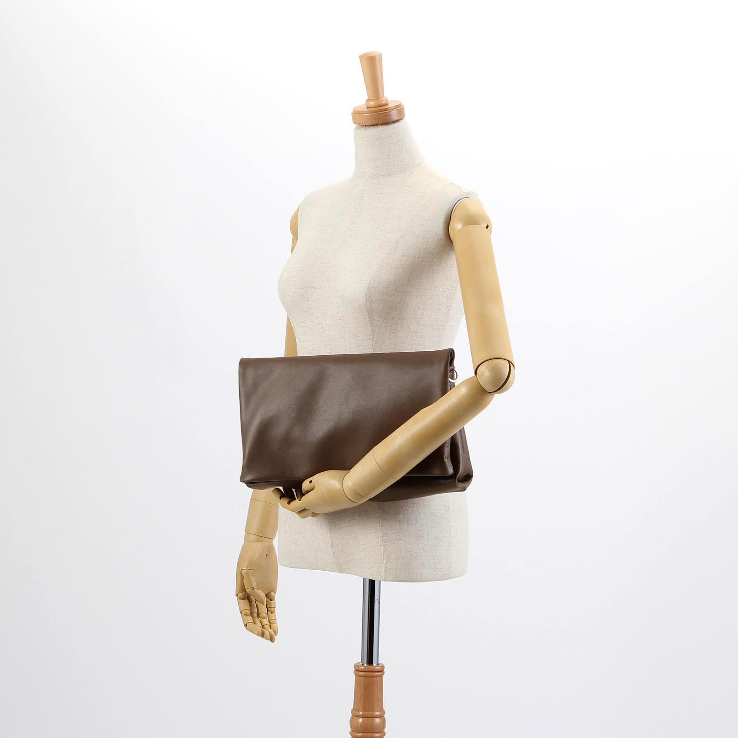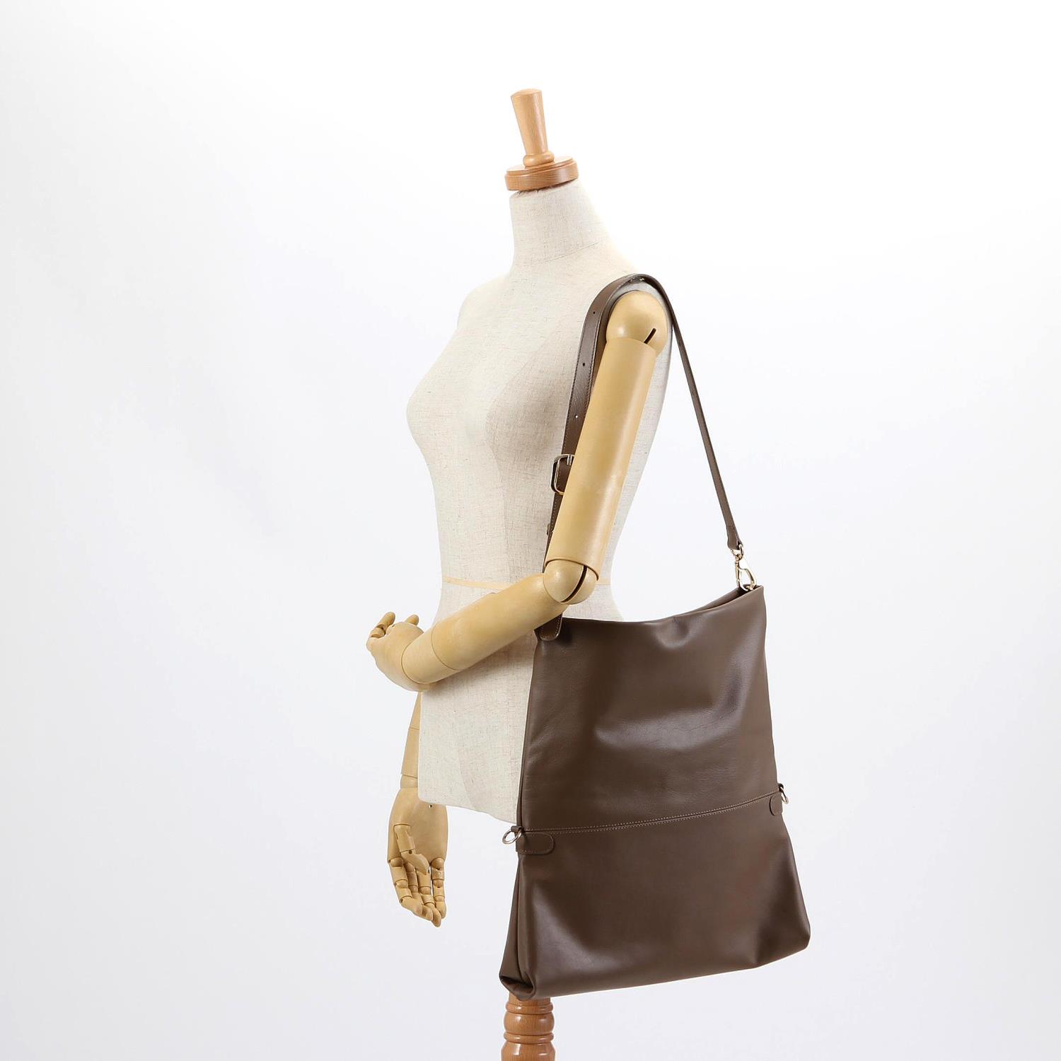 半分でパタッと折るデザインが魅力のショルダーバッグ。 ストラップには50㎜間隔で全長に渡りベルト穴を開け、長さの調節が自在にできる仕様です。 折った状態でショルダー、クラッチ、折らない状態でA4縦型のワンショルとして使用できるマルチWayなアイテムです。