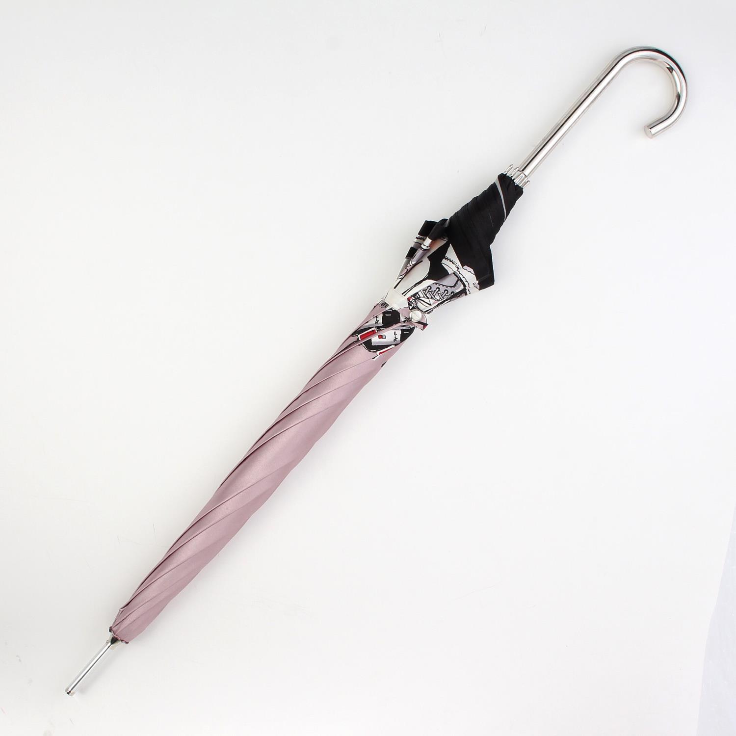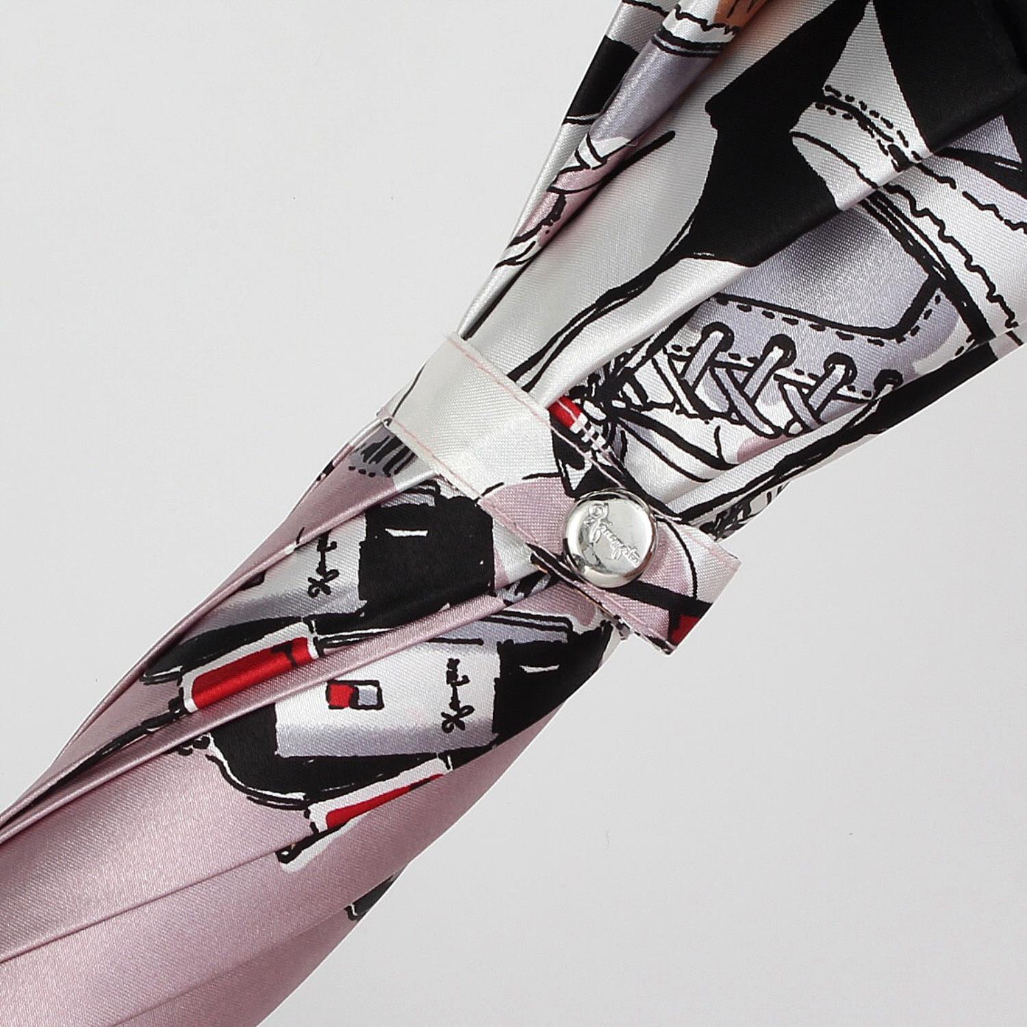 シューズだけでなくファッション雑貨やコスメを描いた女性らしいデザインの長傘。 黒の縁取りが全体の印象を引き締めます。 開きやすいジャンプ式も嬉しいポイントです。