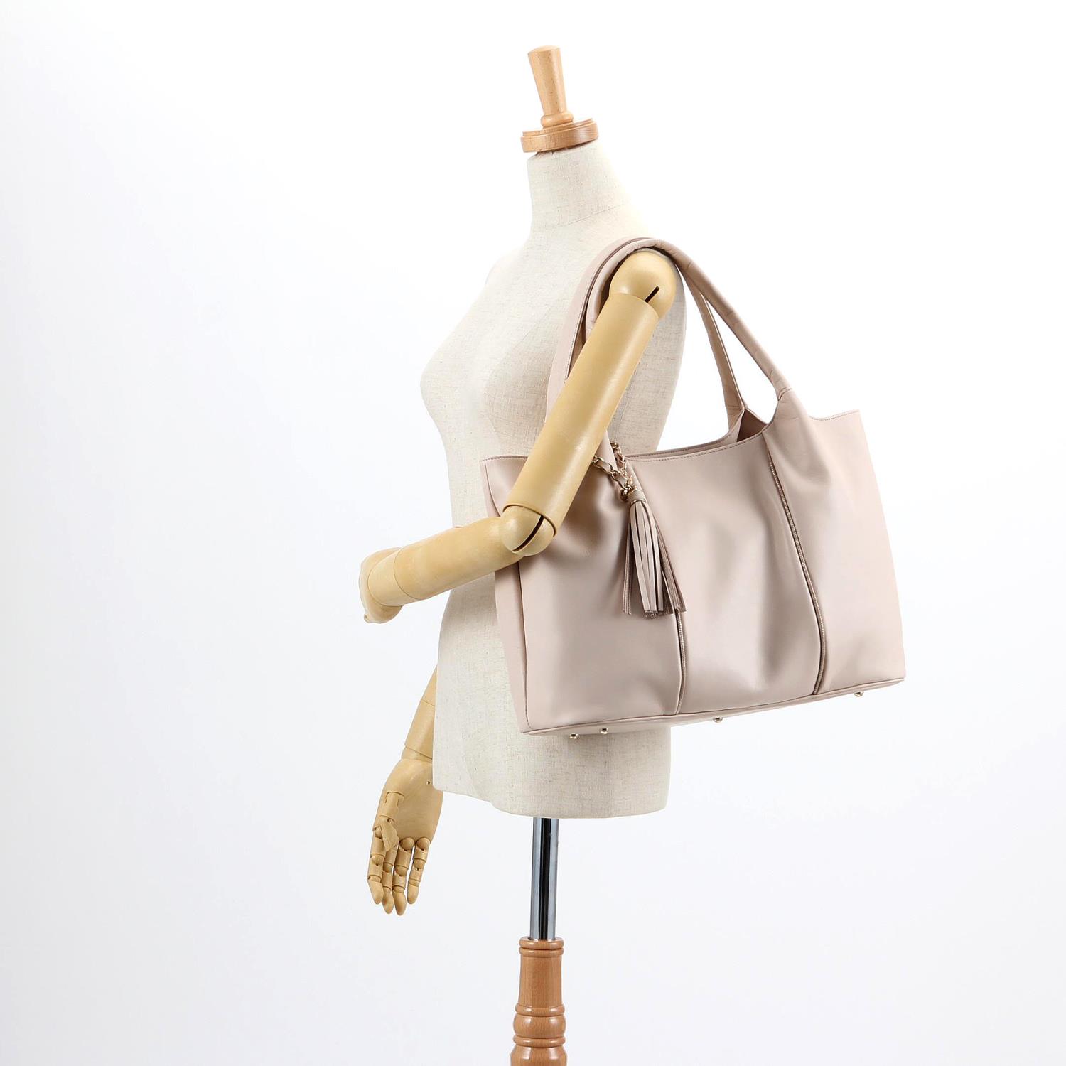 フリンジ飾りがポイントのA4サイズ対応ハンドバッグ。 お仕事にもプライベートにも使いやすいデザインが◎。 ファスナー付きのメイン収納の前後にも収納スペースを設けて荷物を整理しやすくしました。