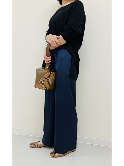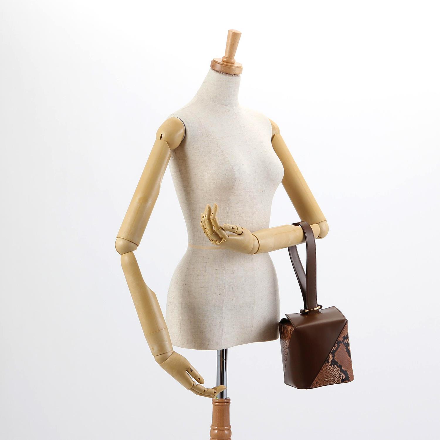 幾何学的なパターンを組み合わせコロンとしたボックス型シルエットがポイントのハンドバッグ。 ボックス型でありながら立方体の角が出ないよう設計し、独特の丸みを持たせているのがポイント。 今シーズントレンドのワンハンドルデザインに付属のリングをスライドさせ開閉させるオリジナリティの詰まったアイテムです。