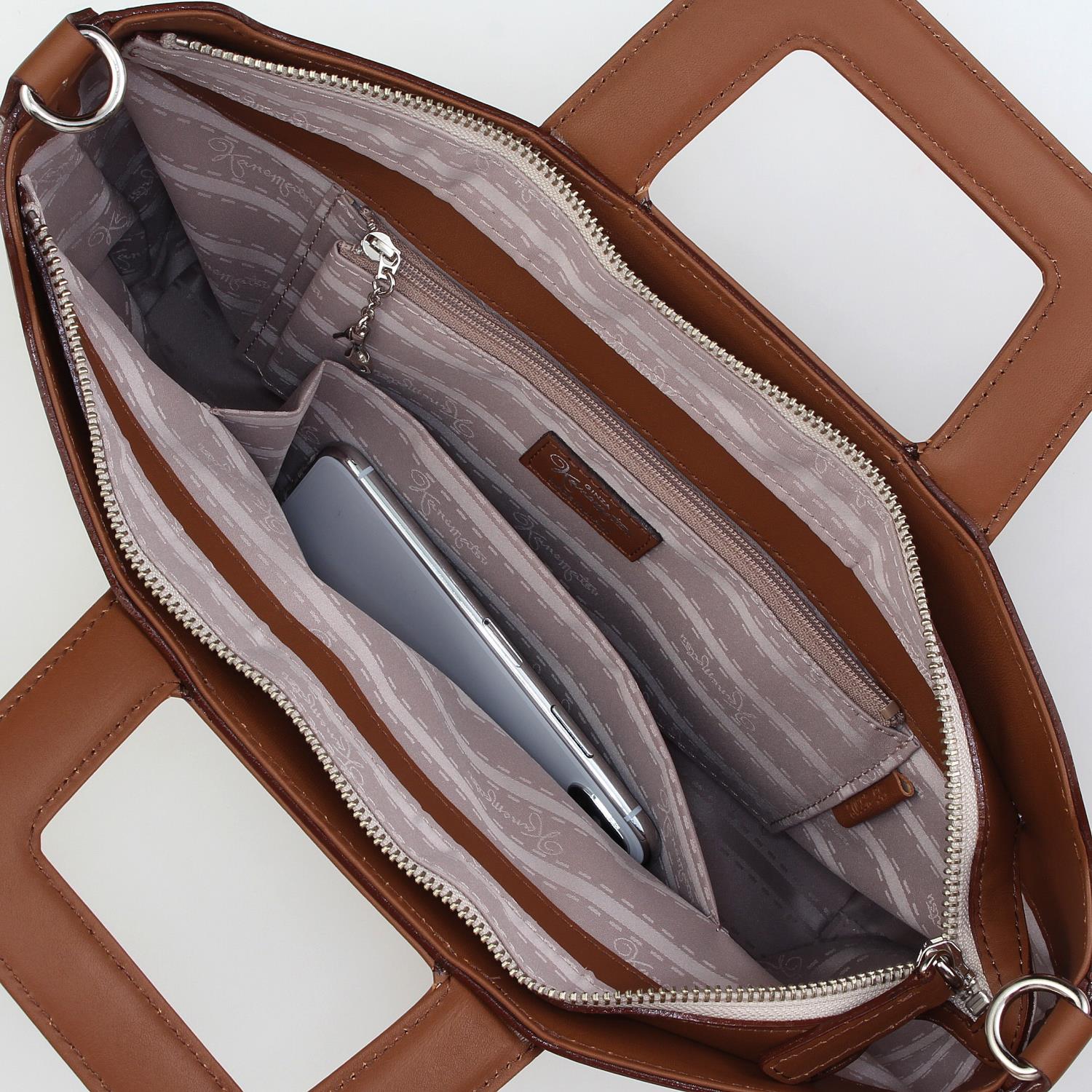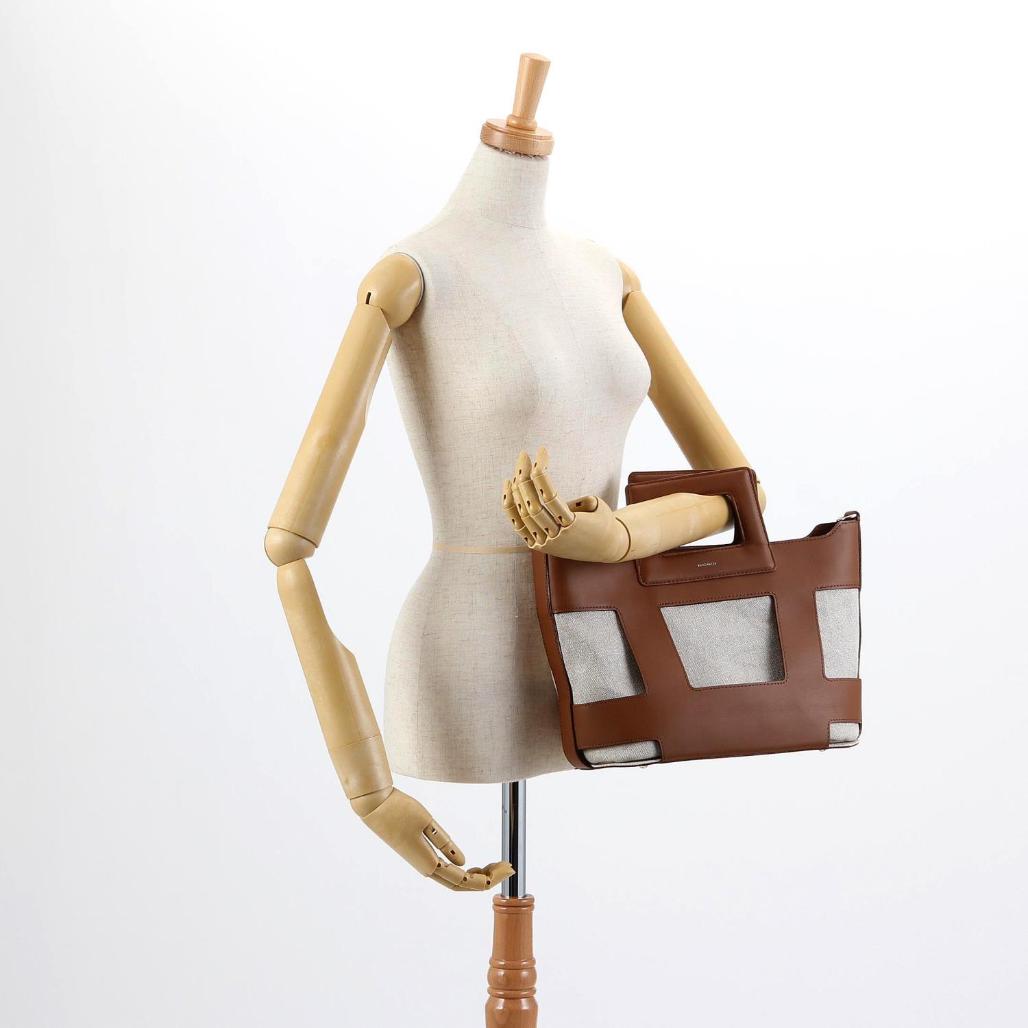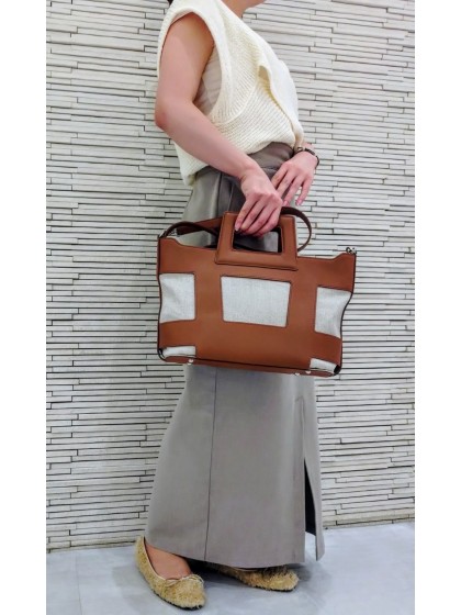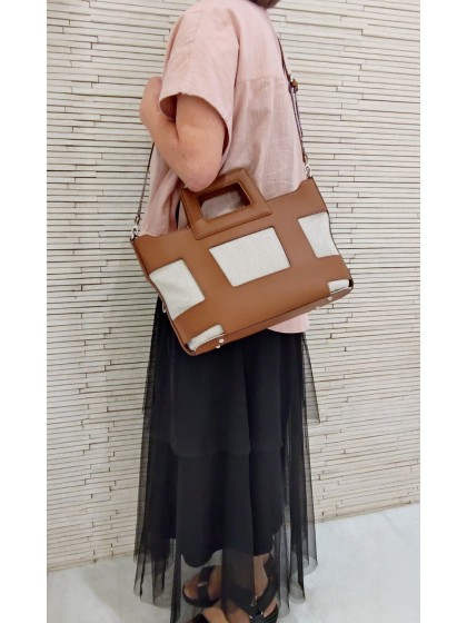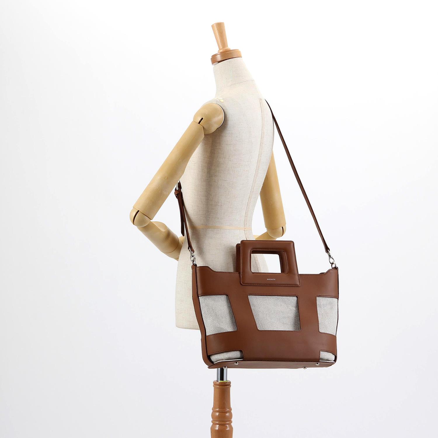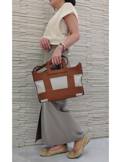 レザーを台形にくり抜きインナーの素材を見せることでクラフト感を出したショルダーバッグ。 天ファスナー仕様で防犯面も◎。 取り外しのできるショルダー紐が付属した2Way仕様です。